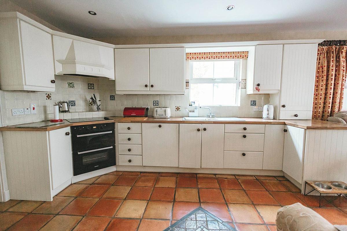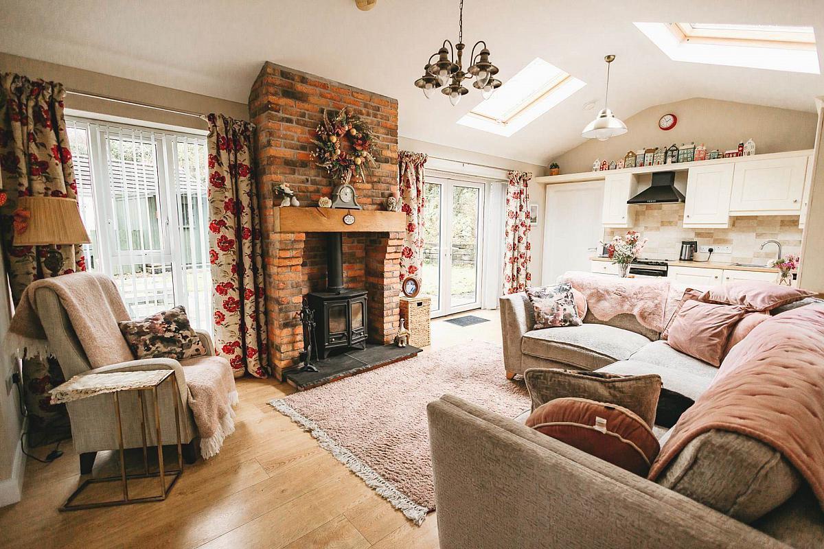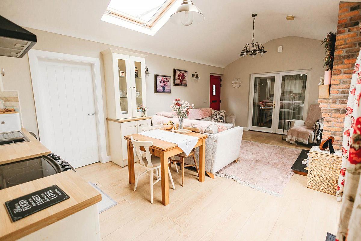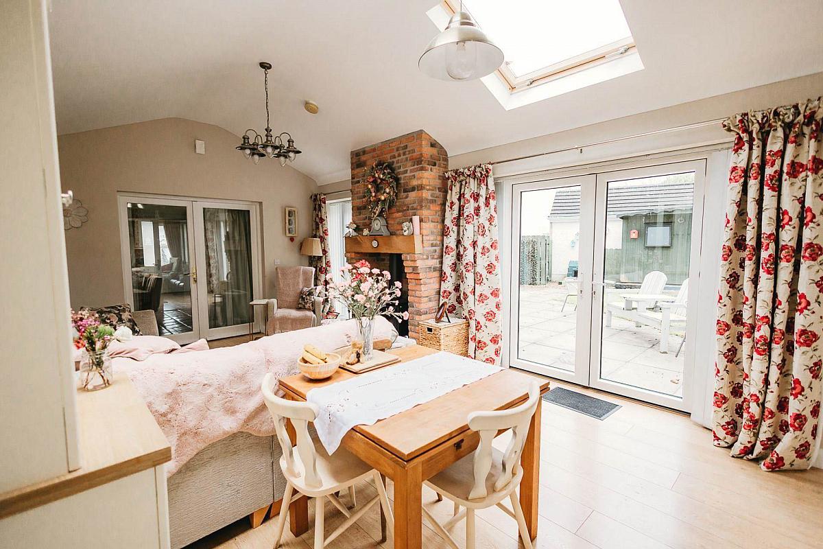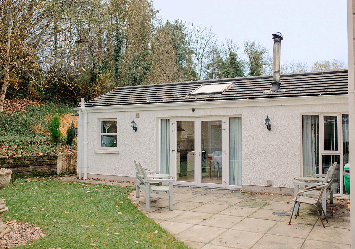 The extension was carried out in 2016 and is thoughtfully designed as a self-contained retreat, complete with a compact kitchen, living room featuring a stove, utility room, private bedroom and a contemporary wetroom. French doors lead to the patio and a separate side entrance enhances convenience and privacy.