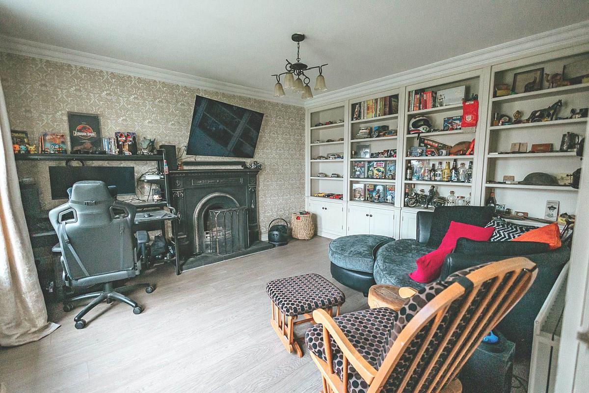 The ground floor boasts a variety of flexible living areas. A welcoming family room with an open fire, while a second lounge area serves as an ideal home office, playroom, or additional bedroom. At the heart of the home is an open-plan kitchen, dining, and lounge area, seamlessly connecting to the front living room via double doors and extending to the patio through the rear extension. Additional ground-floor amenities include a utility room with a larder cupboard and a WC.