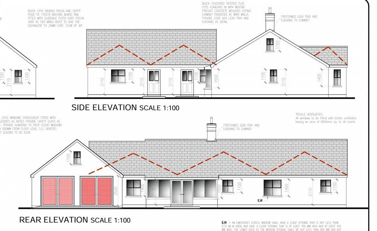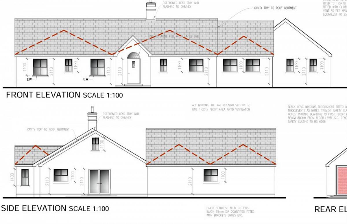 Description of planning approved & commencement certified single storey dwelling with front porch and connected garage along with preliminary floor plans, sections & block plan attached.