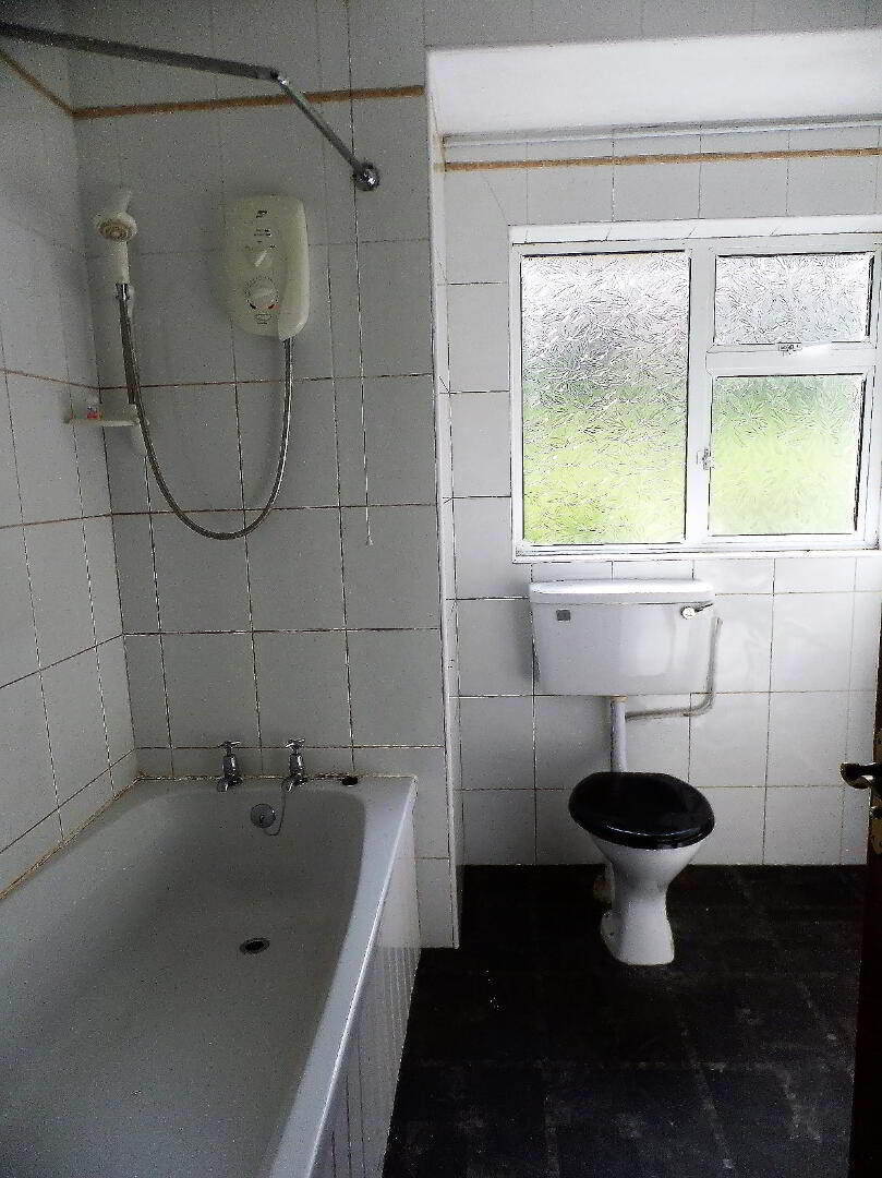 White suite comprising bath, wc and whb. Mira Sport shower over bath. Fully tiled walls. Vinyl floor.