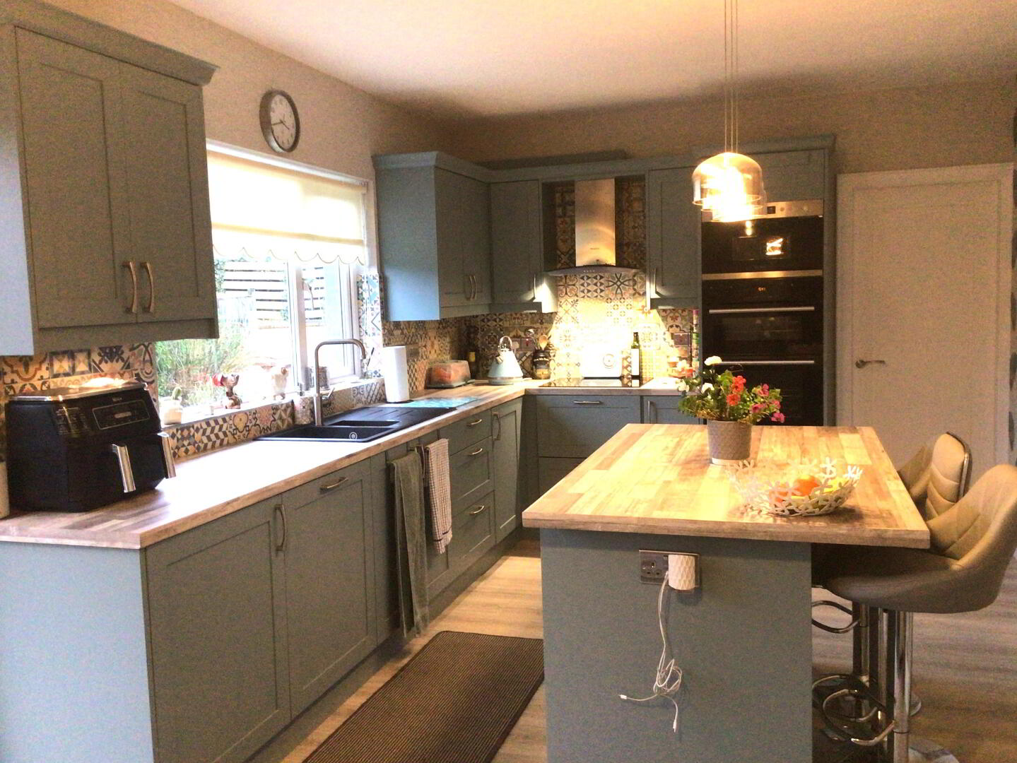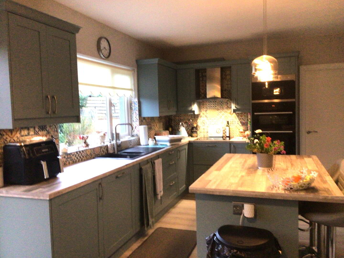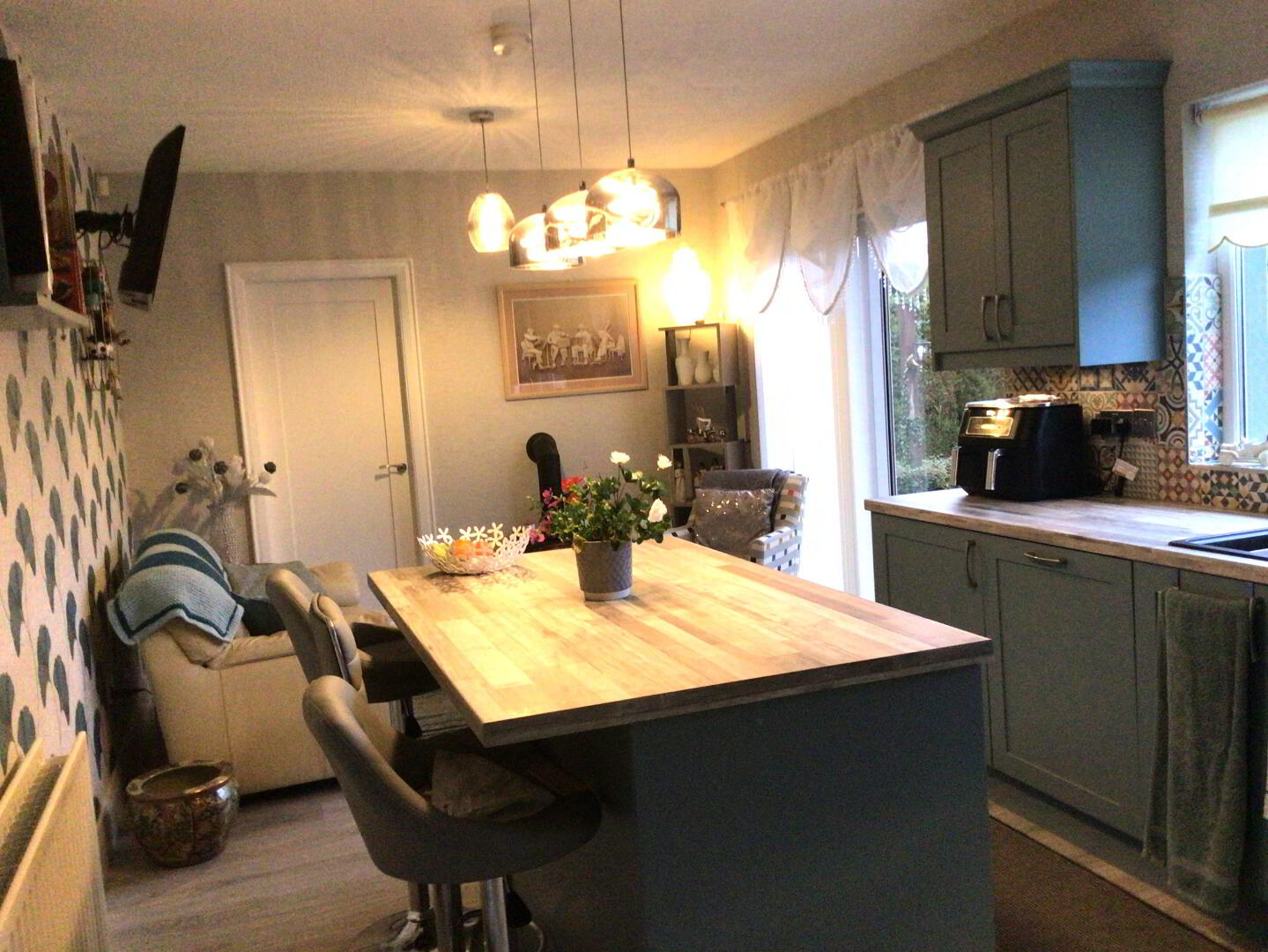 Hafela Kitchen comprising extensive range of modern high & low level units. Indesit built in 4 Plate Infa Red hobb, Built in Hotpoint Double Oven, Built in Indesit Microwave Oven. Hotpoint Stainless Steel Extractor Fan. Single Drainer Sink Unit with Salad Bowl & Mixer Taps. Built in Hoover Dishwasher. Central Island Breakfast Bar. TV Point. Patio Doors to Rear. Egger Laminate Flooring.