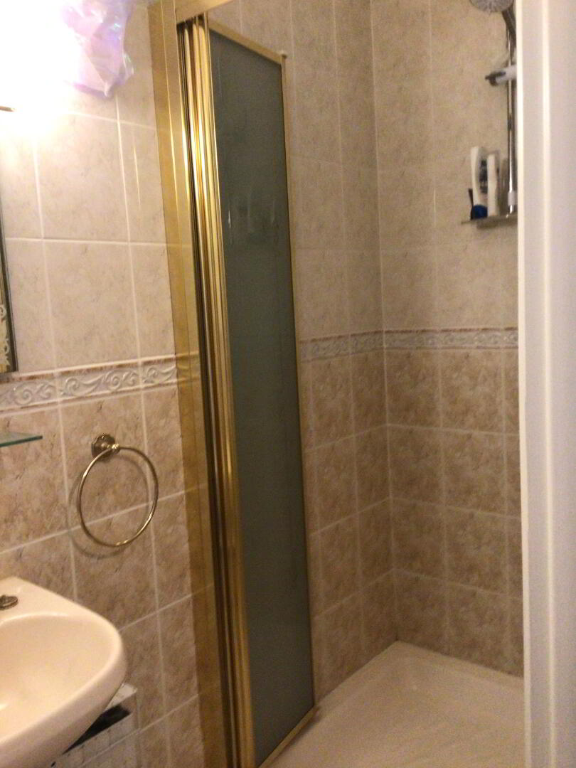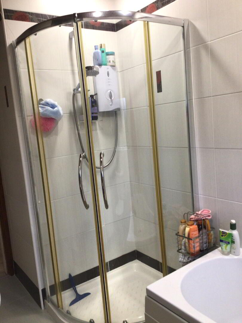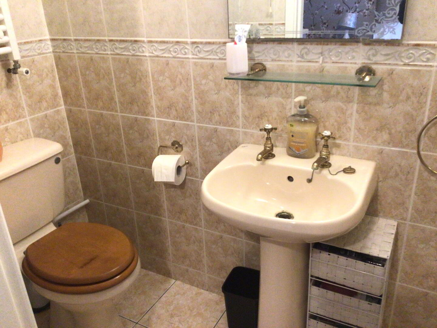 Close Coupled WC, Pedestal Wash Hand Bain, Separate Fully Tiled Shower Cubicle with Mira Electic Shower. Fully Tiled Walls. Fulltiled floors