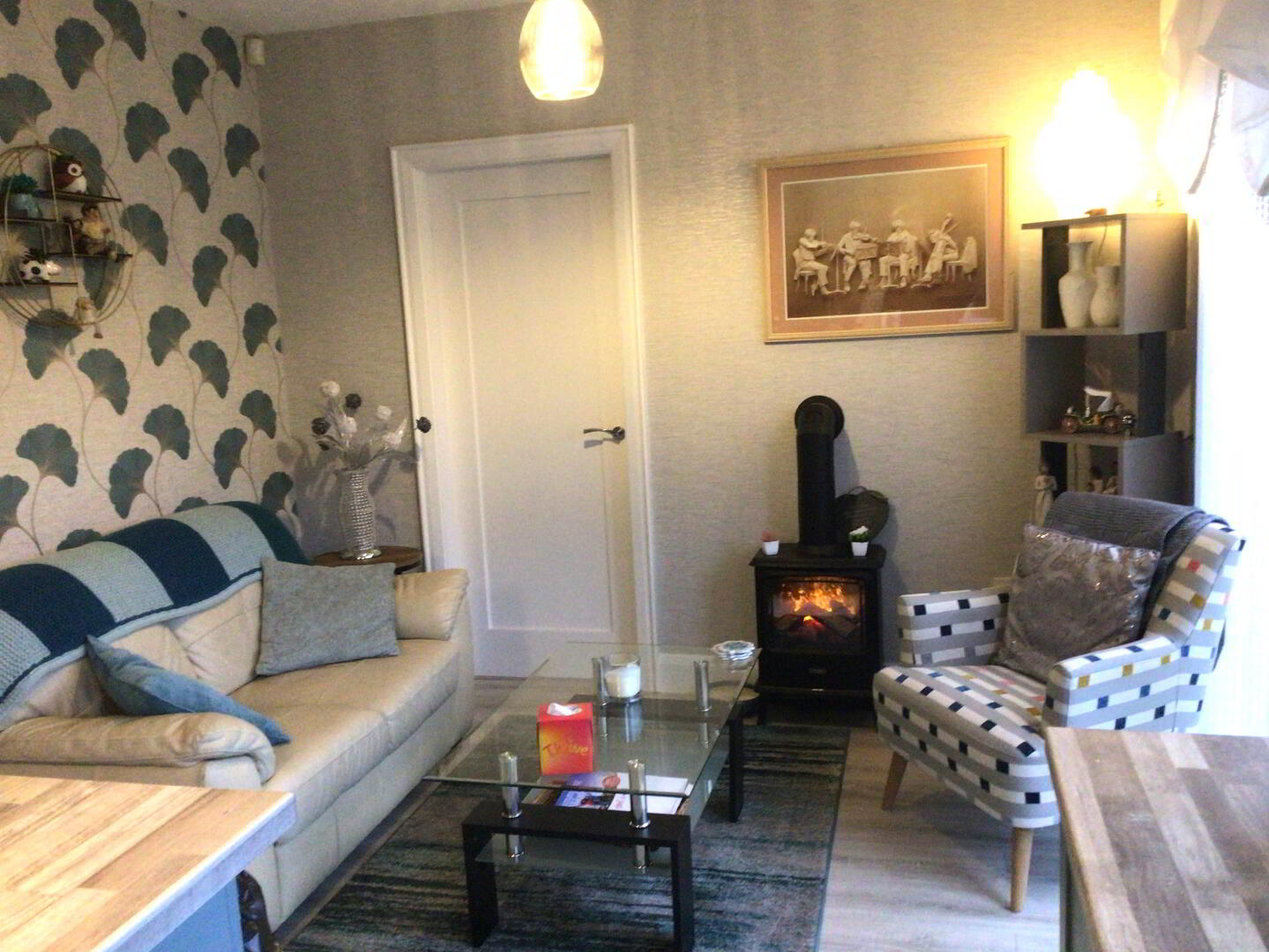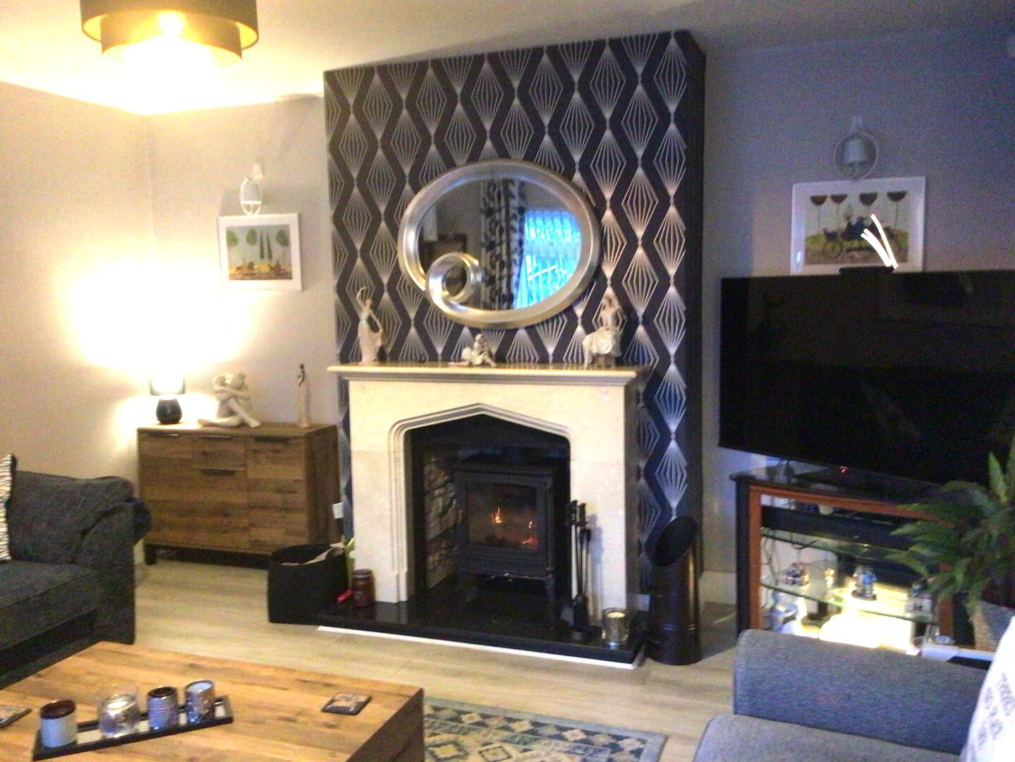Wood Burning Stove set in Marble Surround and Hearth. TV Point. Ample Power Points. Egger Laminate Flooring.