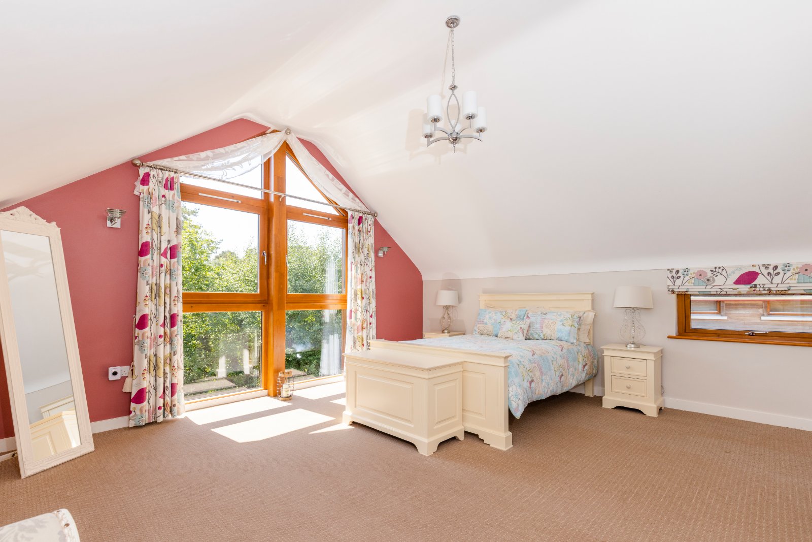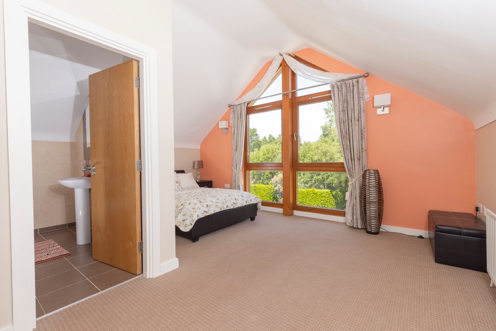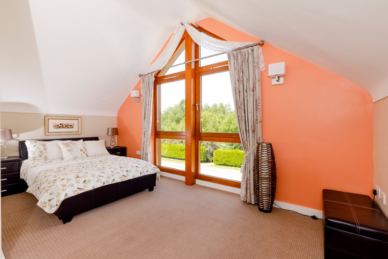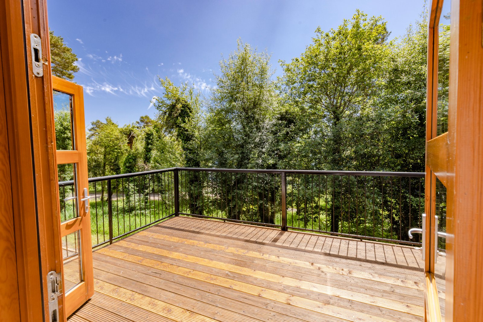 Vaulted ceiling with double picture windows overlooking Lough Shore, decking below and jetties.