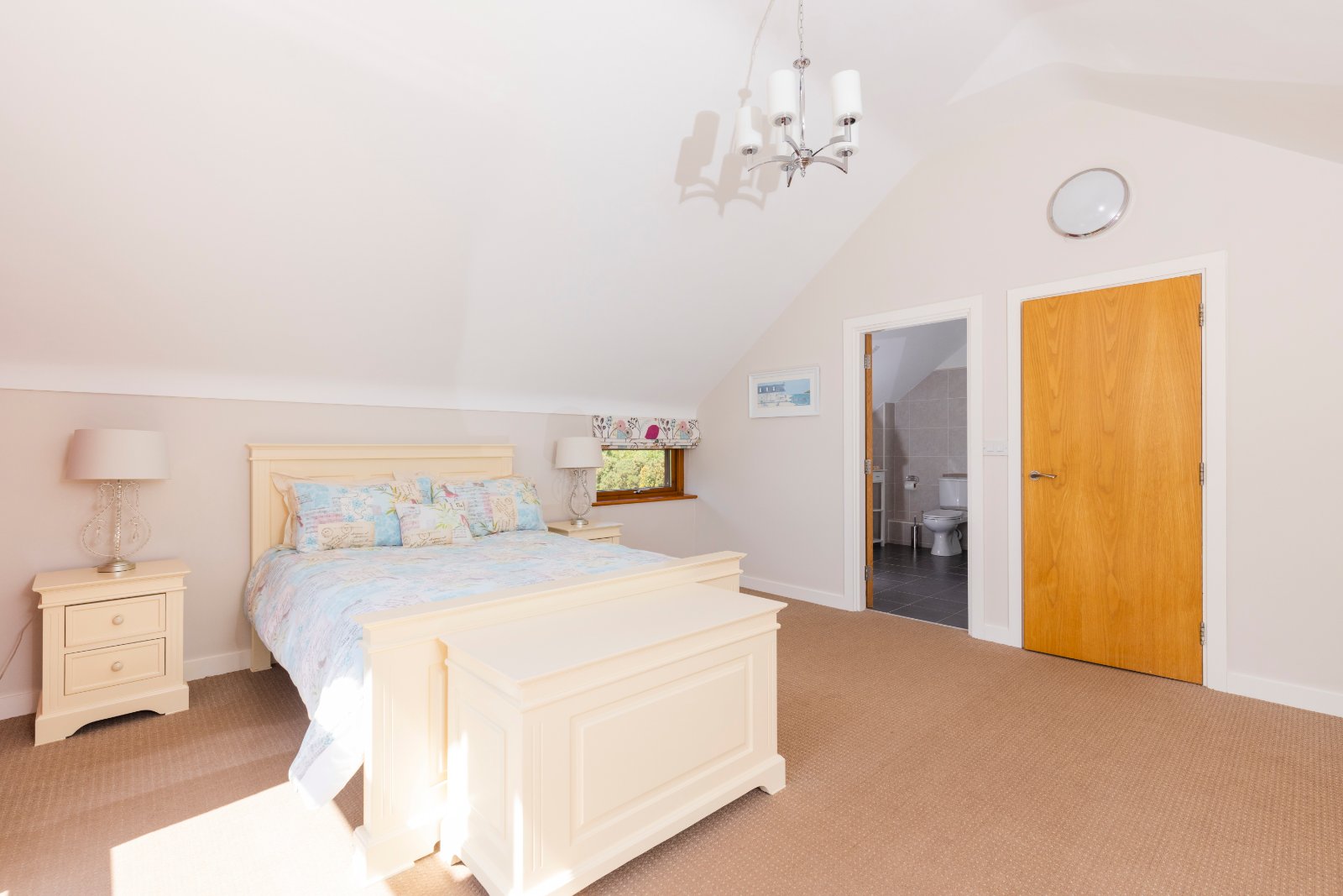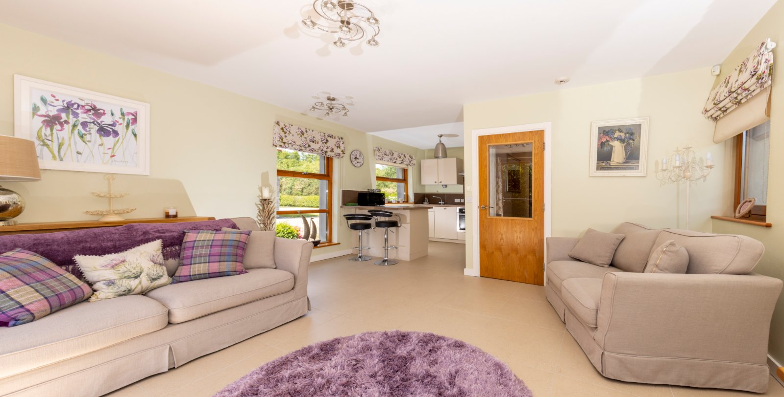 Spacious living area with double doors opening onto large decking to Lough views. Fully tiled floor, recessed lighting.