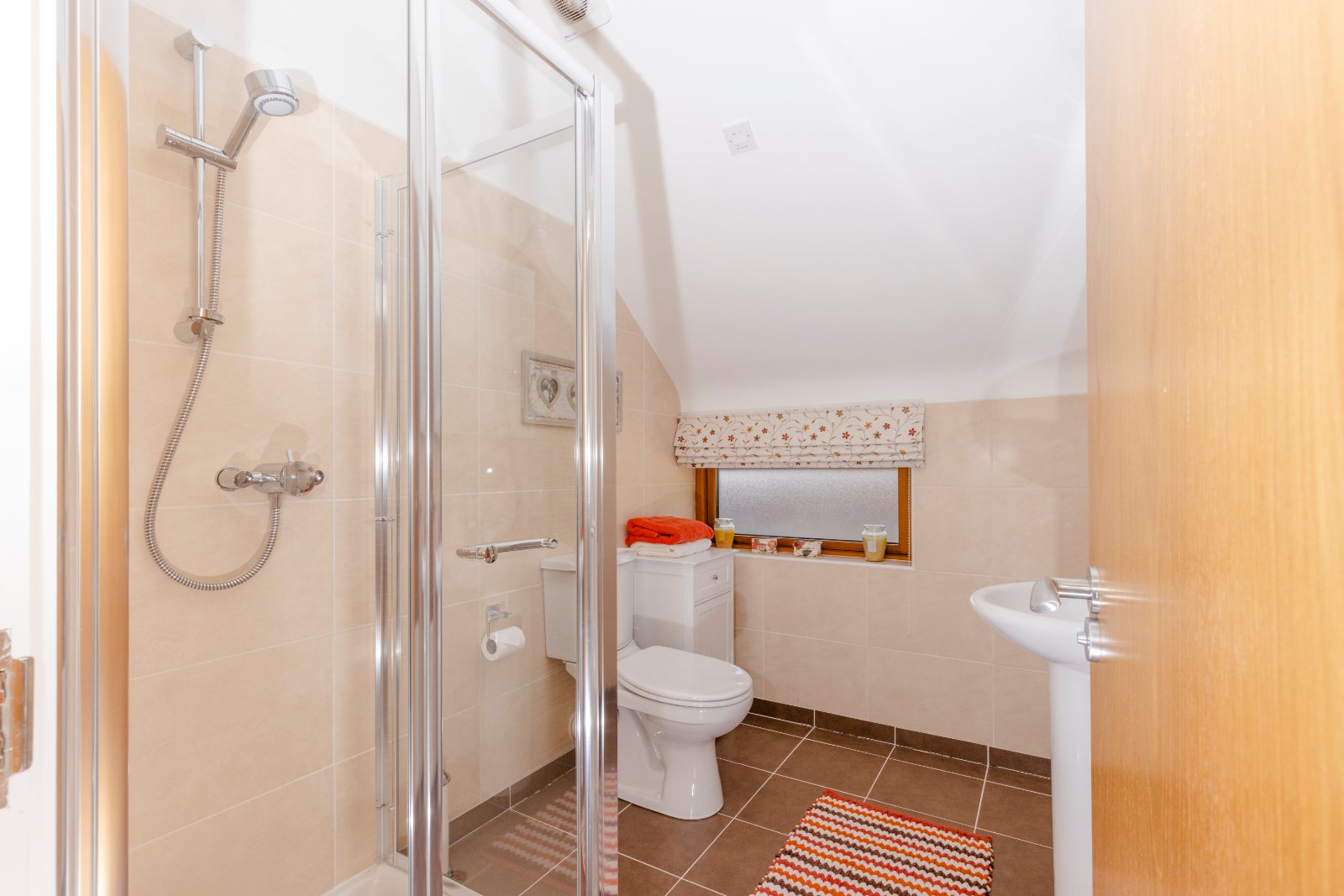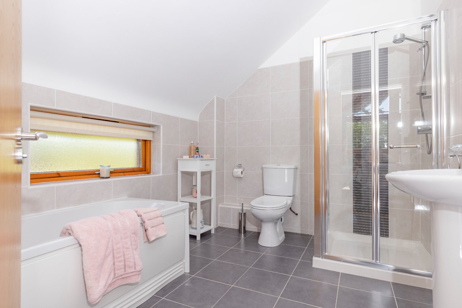 2 piece suite with separate shower cubicle. Fully tiled walls and floor.
