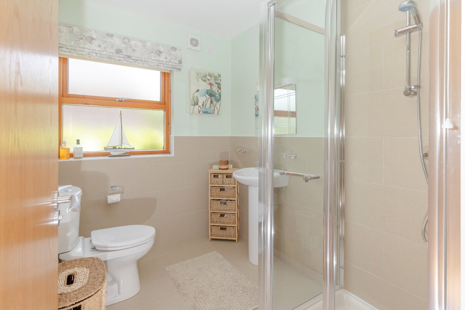 The home offers three generous bedrooms, two of which benefit from modern ensuite shower rooms. A deluxe family shower room further enhances the quality and comfort on offer. Underfloor heating at ground level, gas-fired central heating, and uPVC double glazing ensure year-round comfort and energy efficiency.