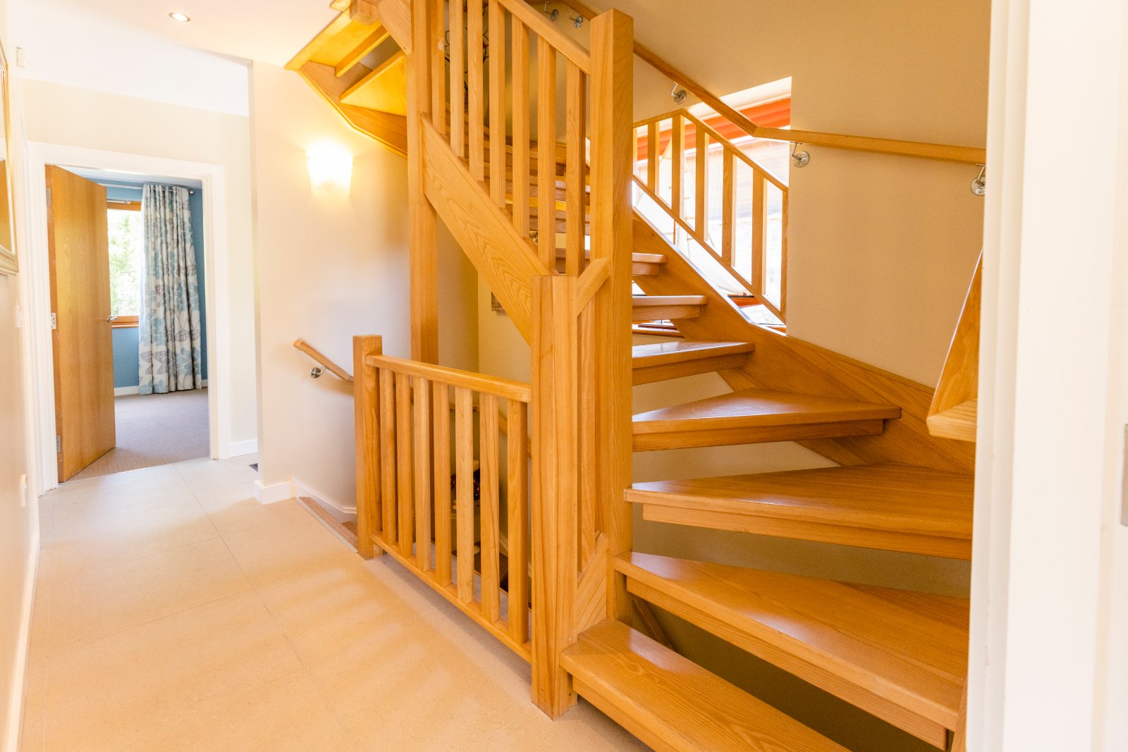 Wall lighting. Ceramic tiled flooring. Feature Oak finished stairs. Stairway to first and basement level.
