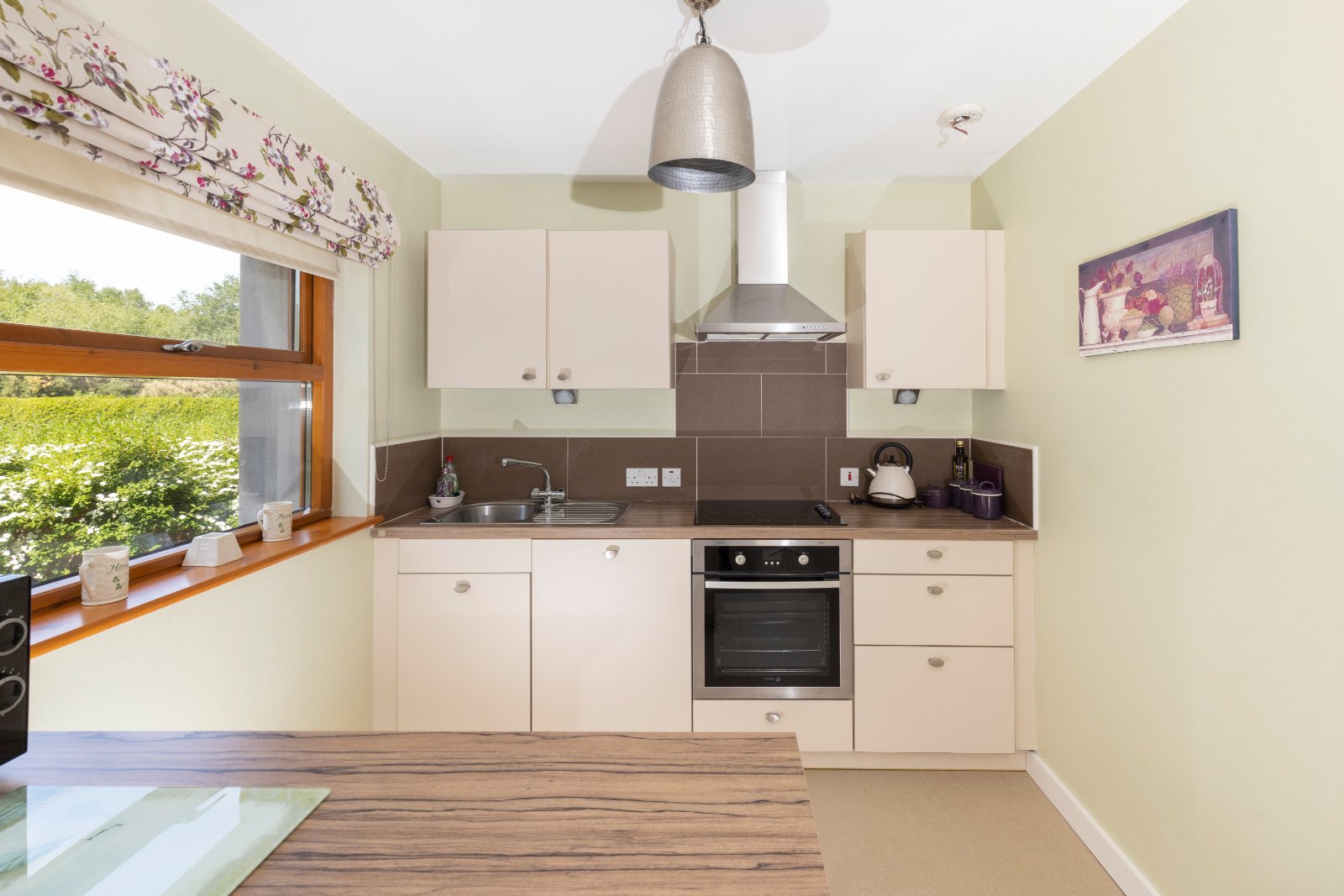 Range of high and low level units incorporating, oven/hob, extractor fan, integral fridge, integral dishwasher. Fully tiled floor, part tiled walls.