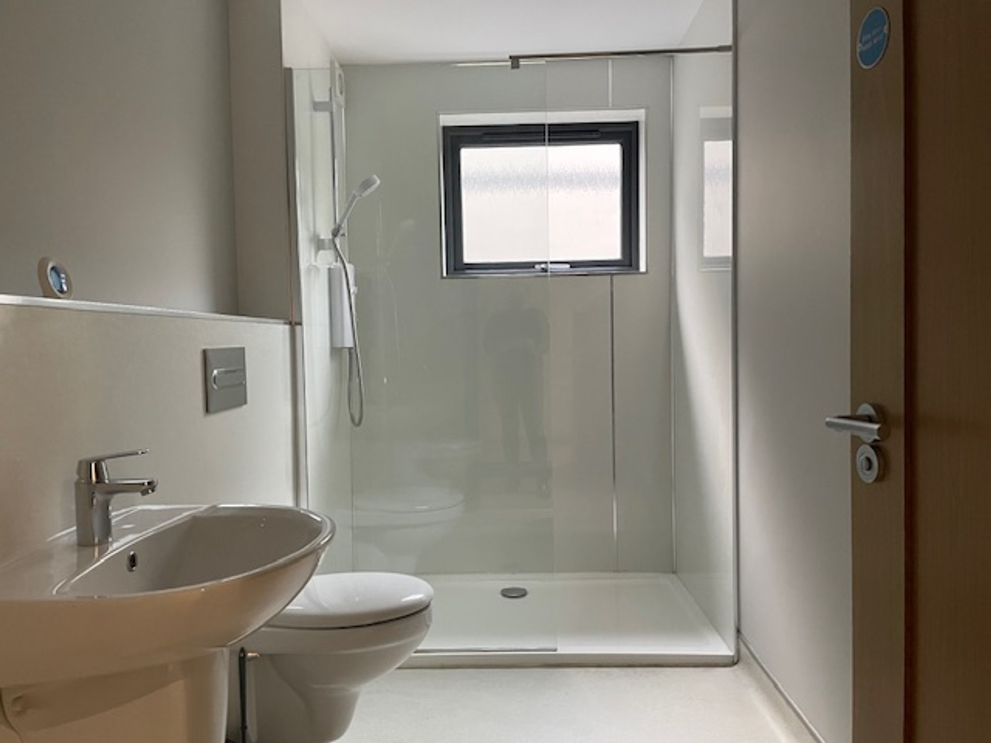 - Bathroom: The bathroom is modern with a spacious shower area ,toilet and hand basin.