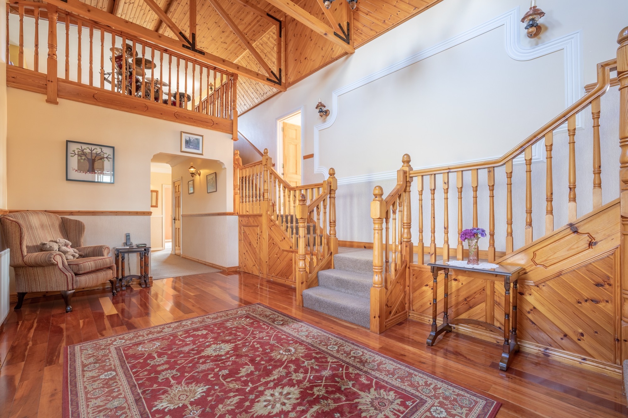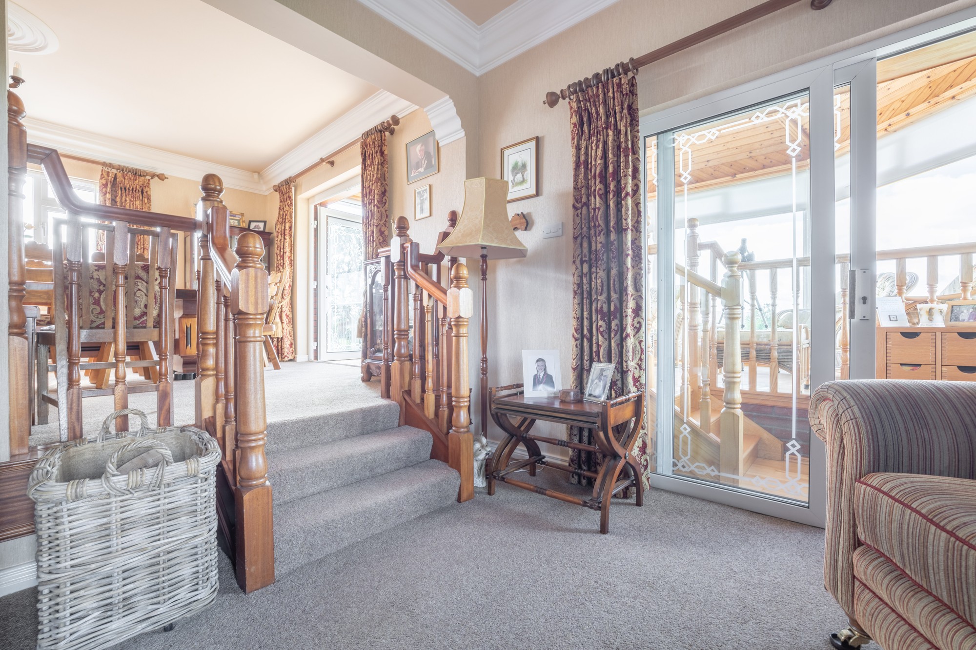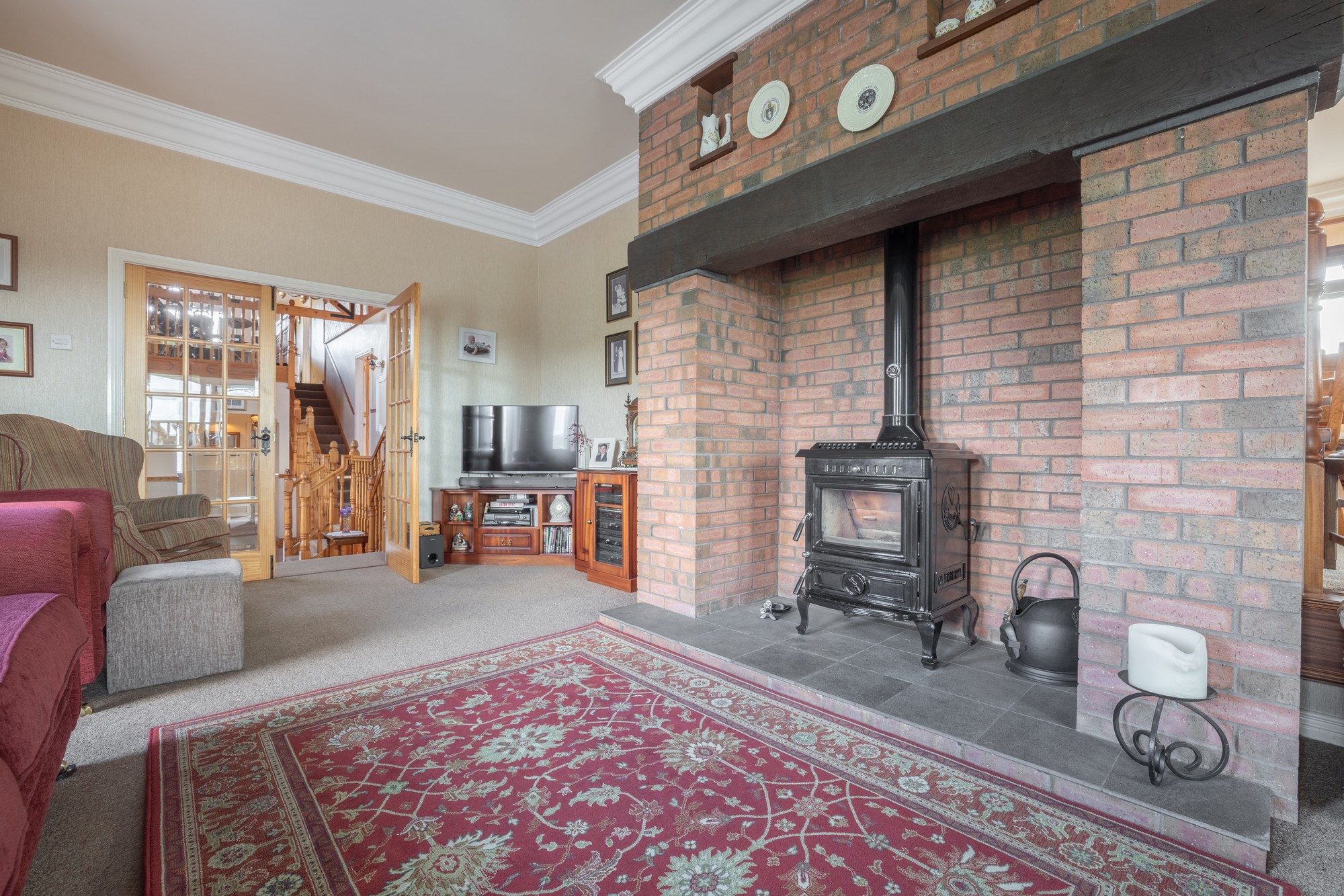 Accessed via automated gates and a sweeping driveway, the property immediately impresses with its scale, privacy, and versatility. The residence offers beautifully appointed accommodation throughout, combining high-quality finishes with a thoughtfully designed layout ideal for modern family living. Spacious reception areas, including a striking double-height entrance hall, a feature lounge with multi-fuel stove, and a sunroom with vaulted ceiling, all take full advantage of the spectacular views.