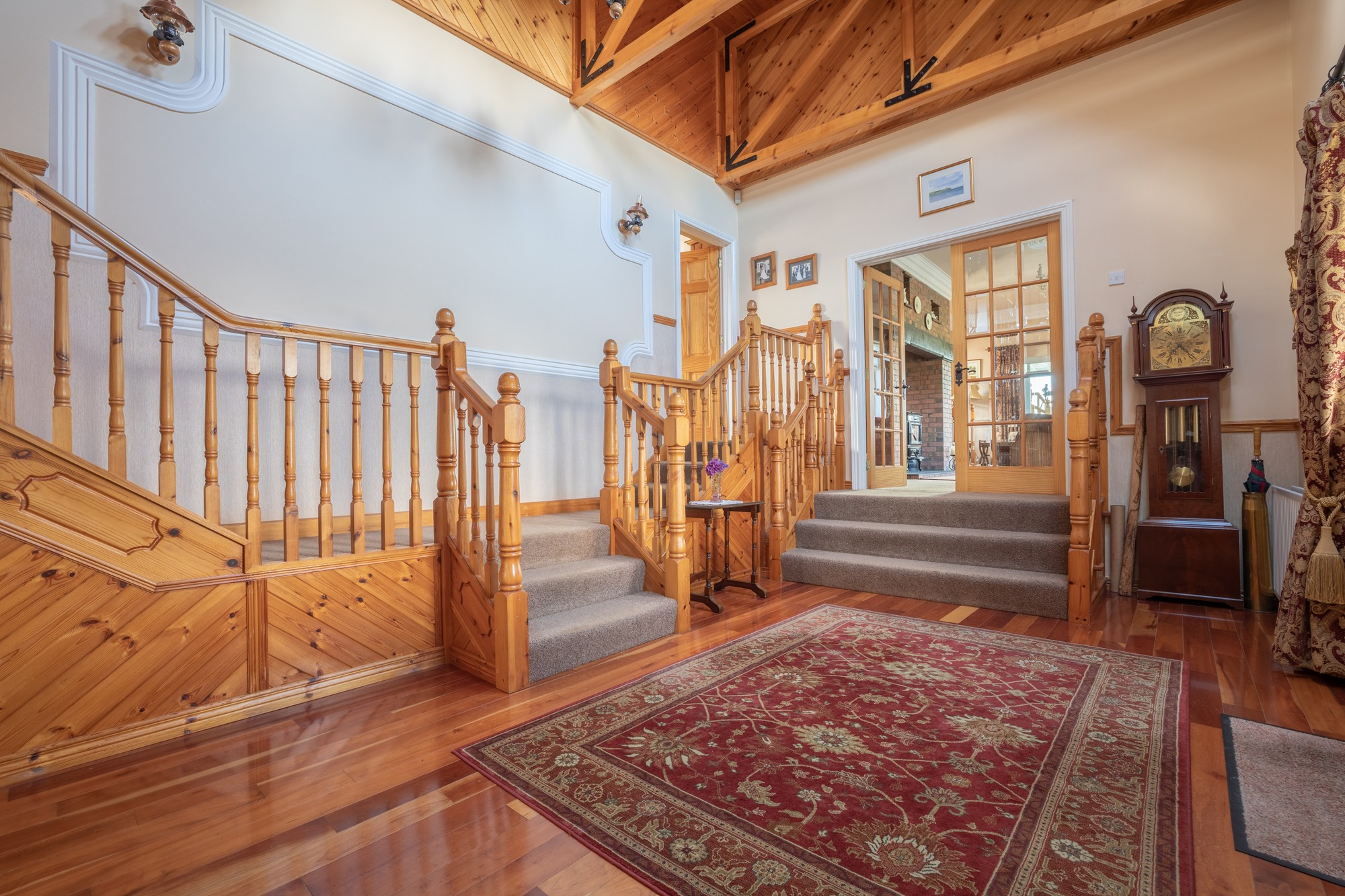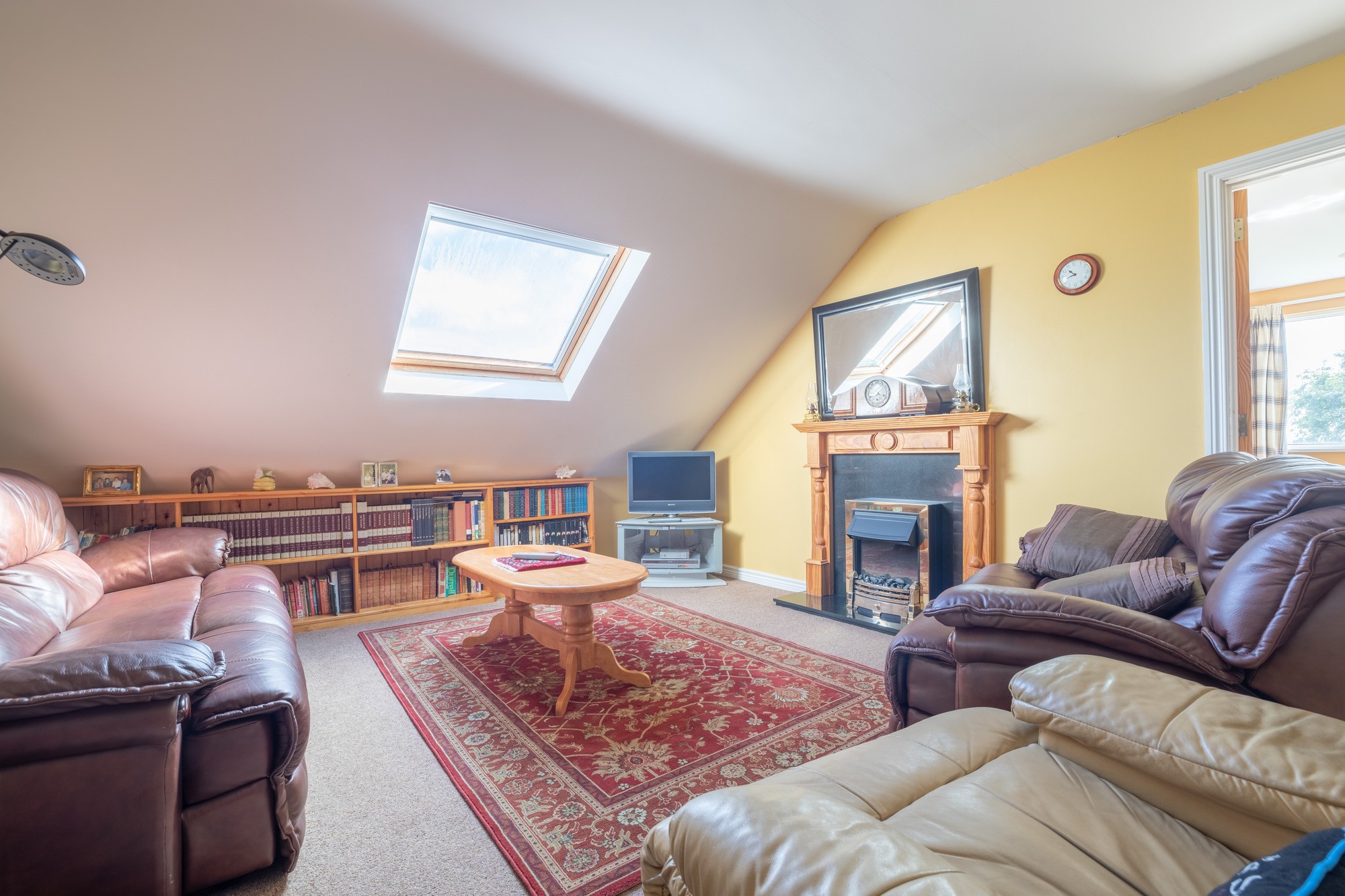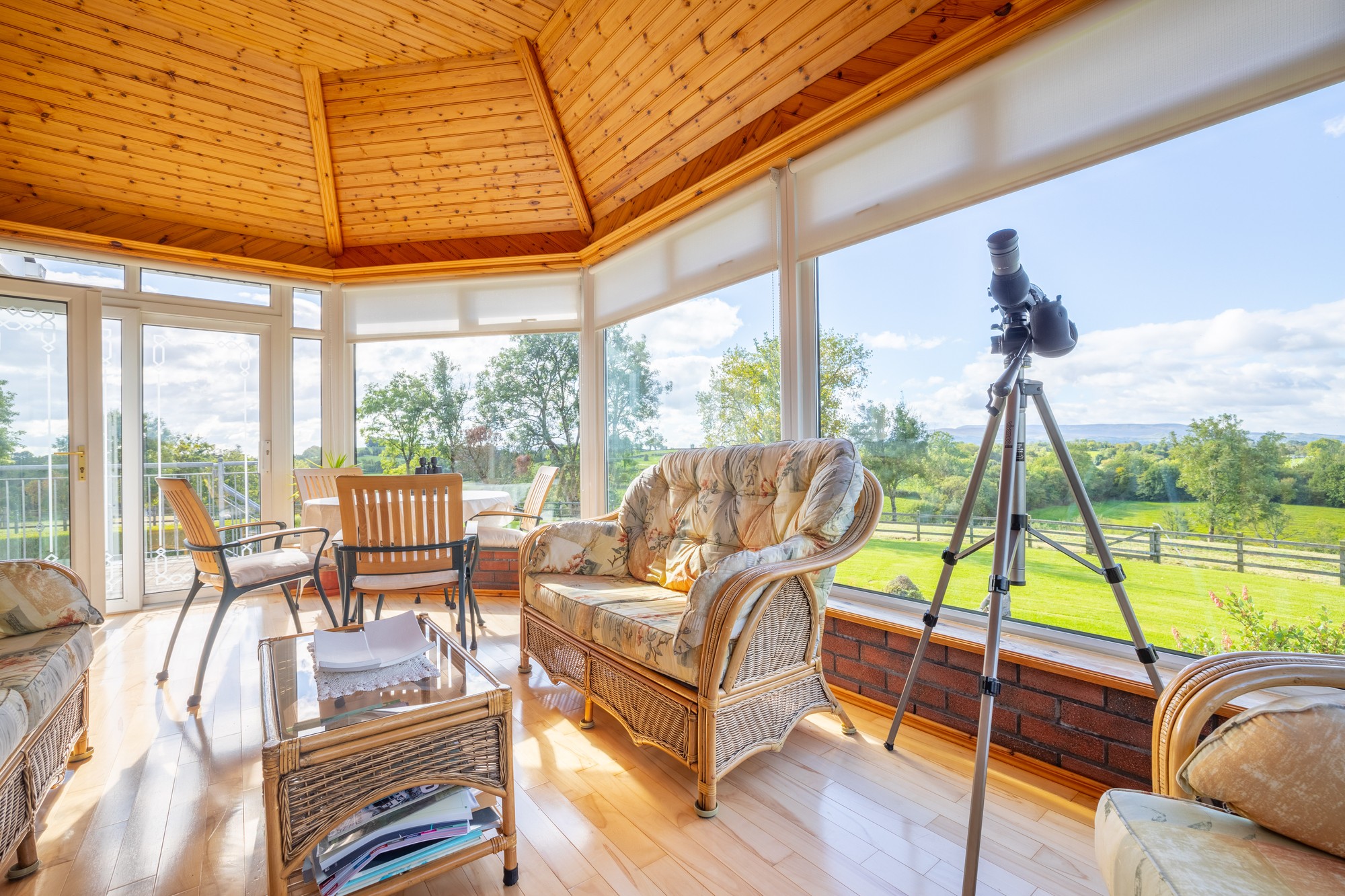 Accessed via automated gates and a sweeping driveway, the property immediately impresses with its scale, privacy, and versatility. The residence offers beautifully appointed accommodation throughout, combining high-quality finishes with a thoughtfully designed layout ideal for modern family living. Spacious reception areas, including a striking double-height entrance hall, a feature lounge with multi-fuel stove, and a sunroom with vaulted ceiling, all take full advantage of the spectacular views.
