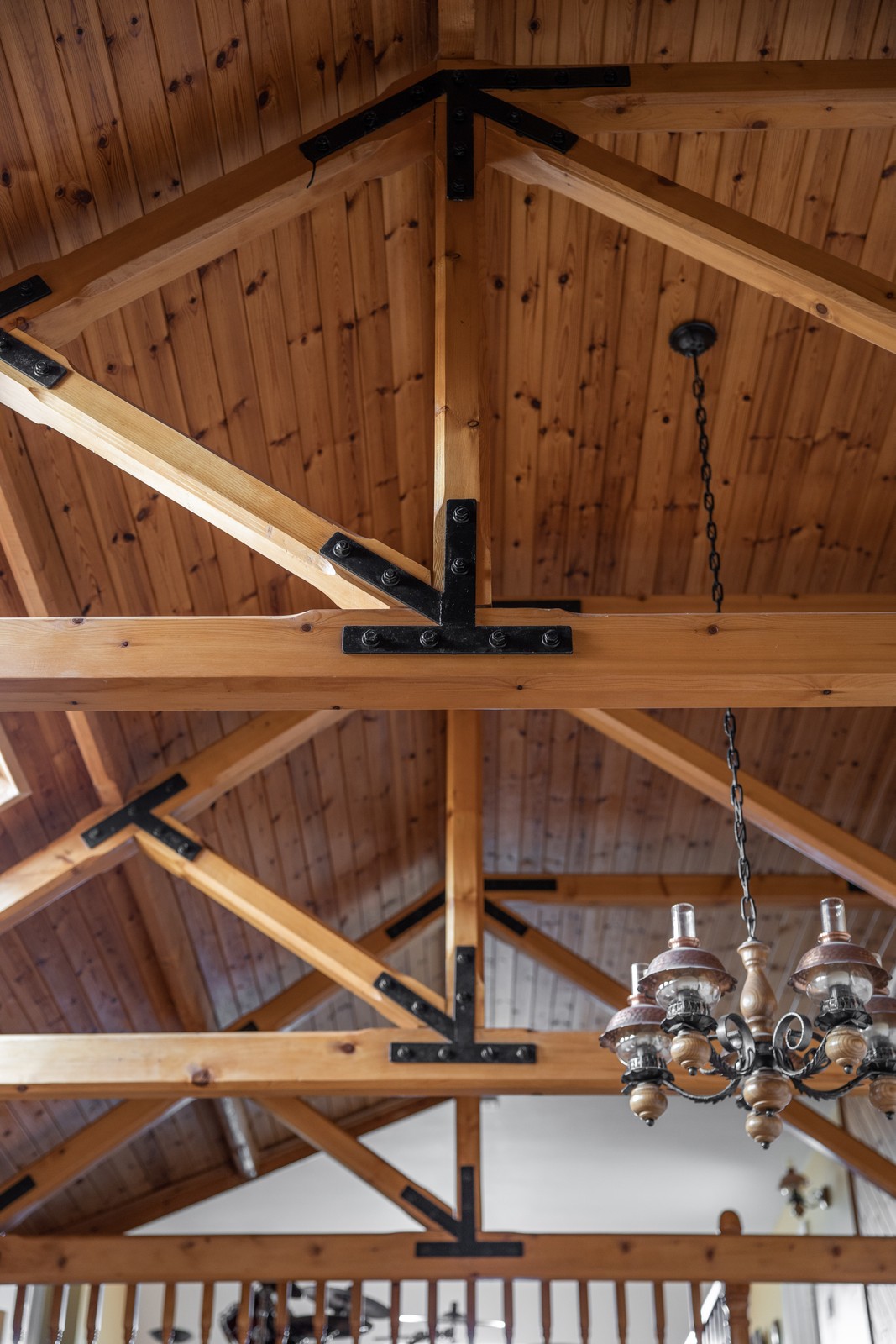 - Ballustraded viewing through hand cut roof trusses and onto hall.