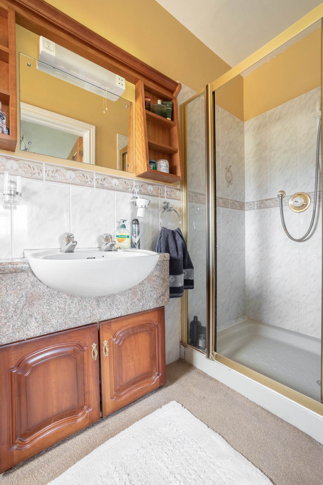 Shower Room with electric shower compartment, W.C, whb vanity unit, fully tiled walls.