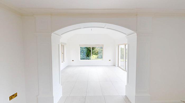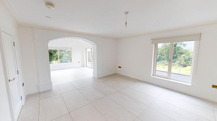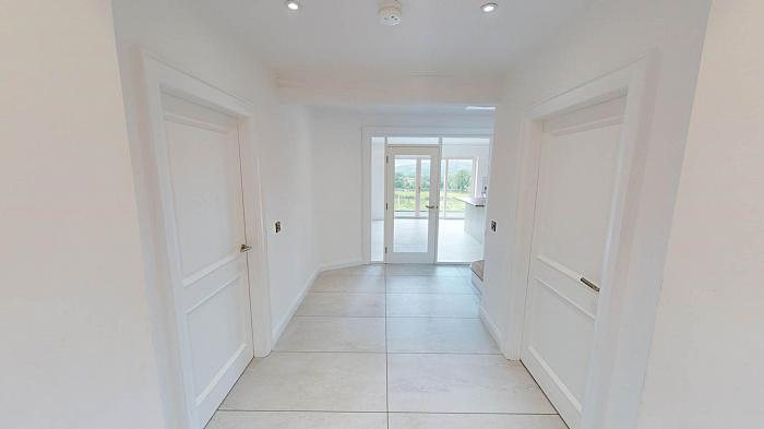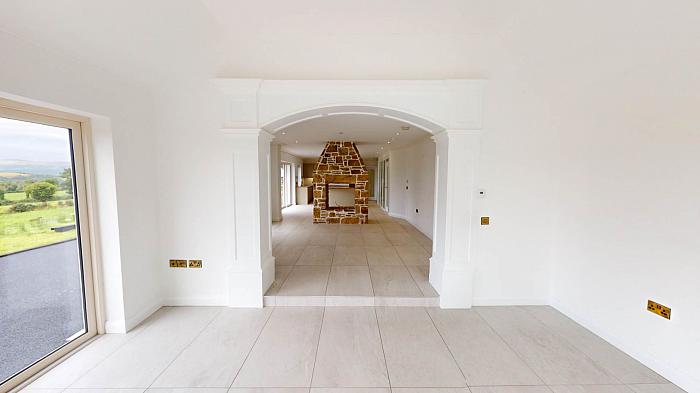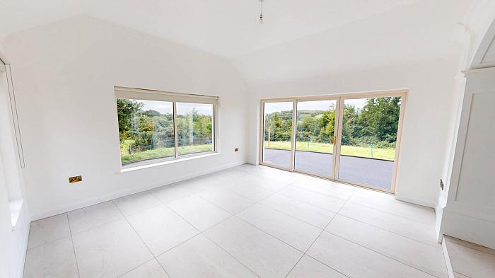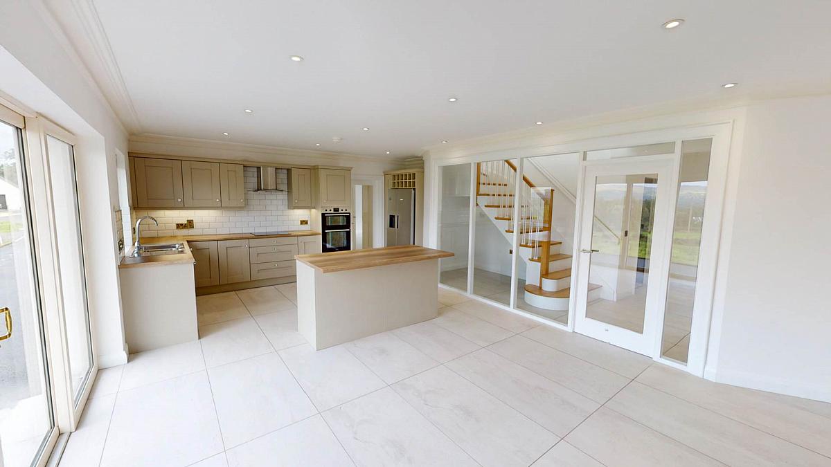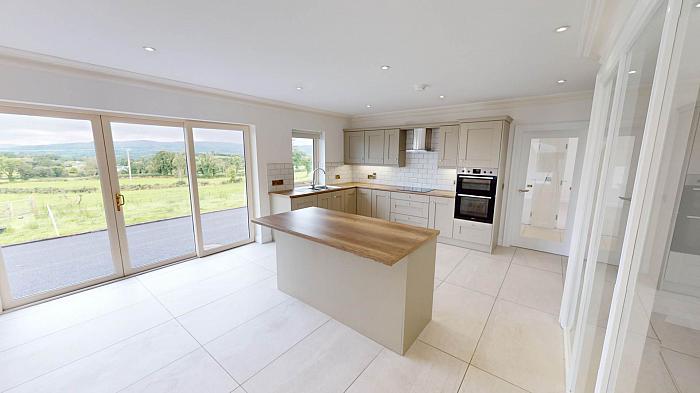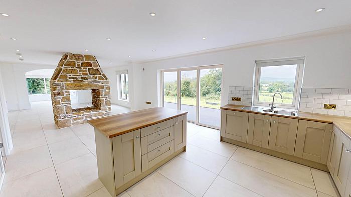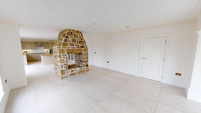 o Gourmet Kitchen: The heart of the home is the open-plan kitchen, dining, and living area, which is bathed in natural light and offers panoramic views of the surrounding countryside. The kitchen is fully equipped with high-end appliances and features a large island with a breakfast bar, complemented by a bespoke double-sided stone-faced fireplace. Sliding doors open to the rear, enhancing the connection between indoor and outdoor living.