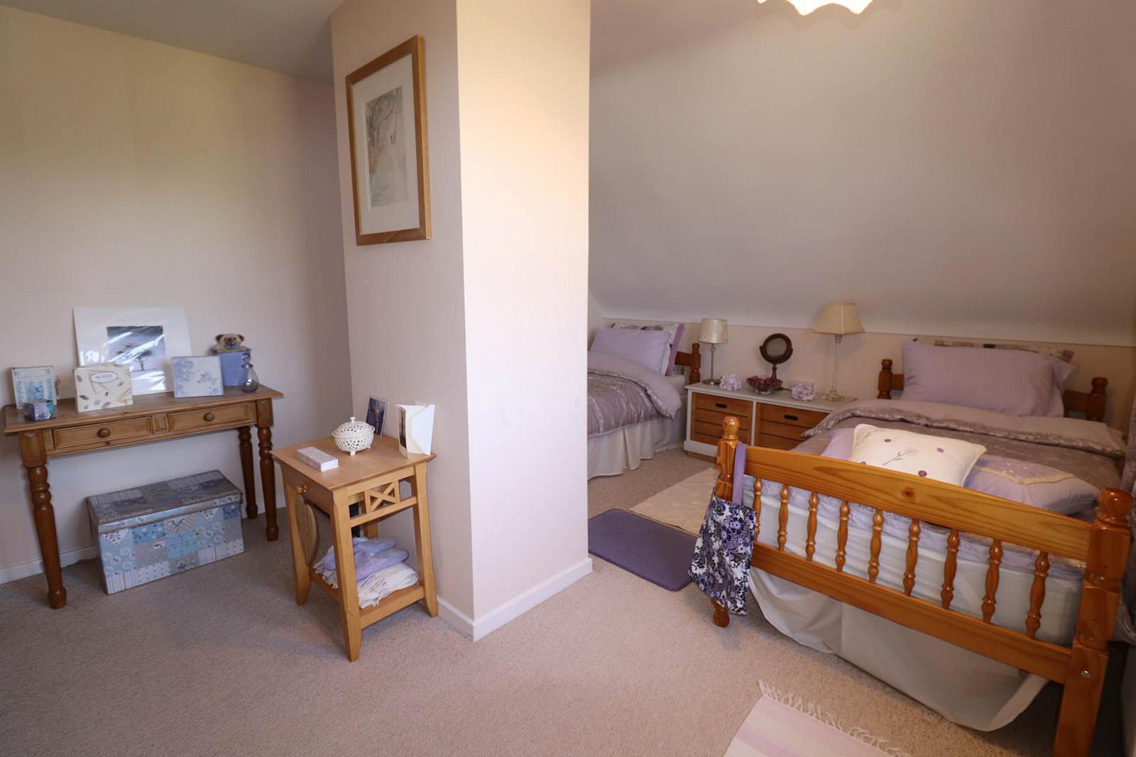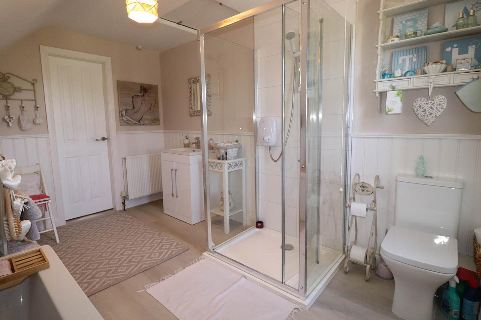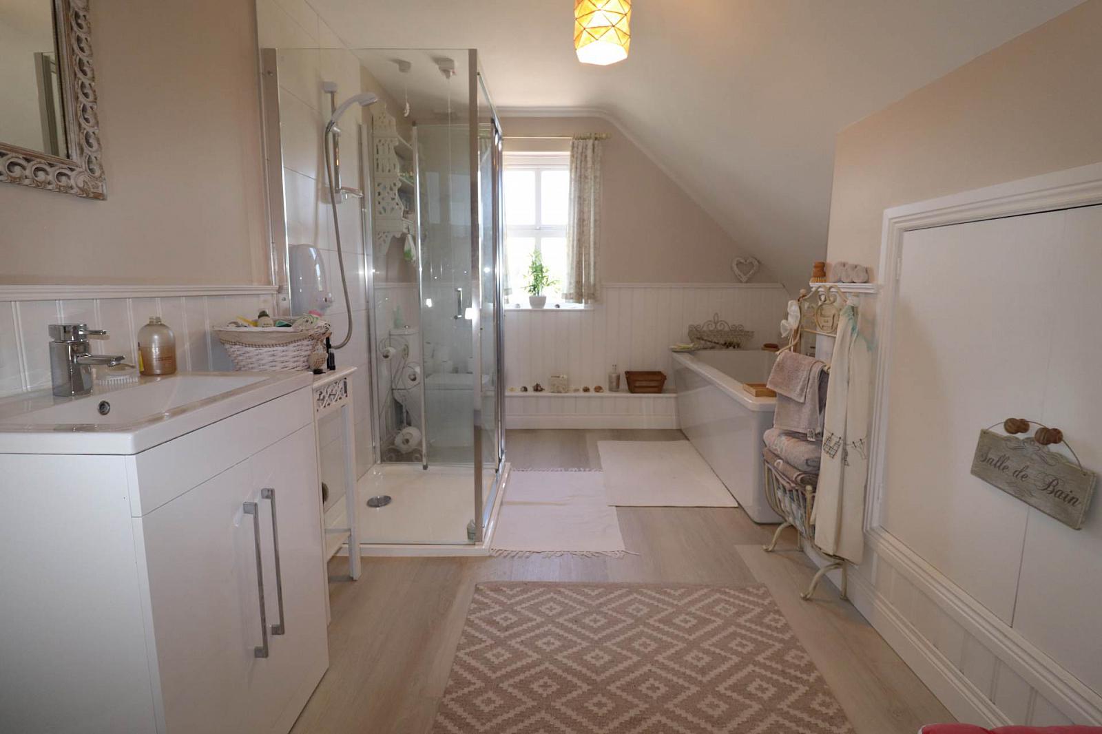 One of the three generously sized bedrooms is conveniently located on the ground floor, alongside a bathroom complete with a walk-in shower, WC, and a wash hand basin with vanity unit, ideal for ground-floor living needs.