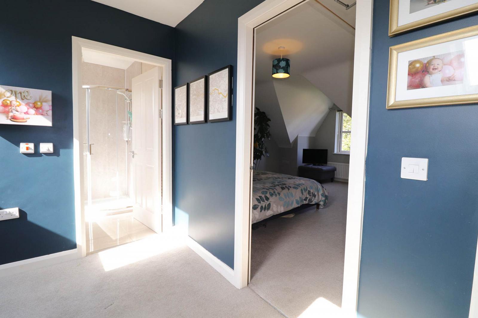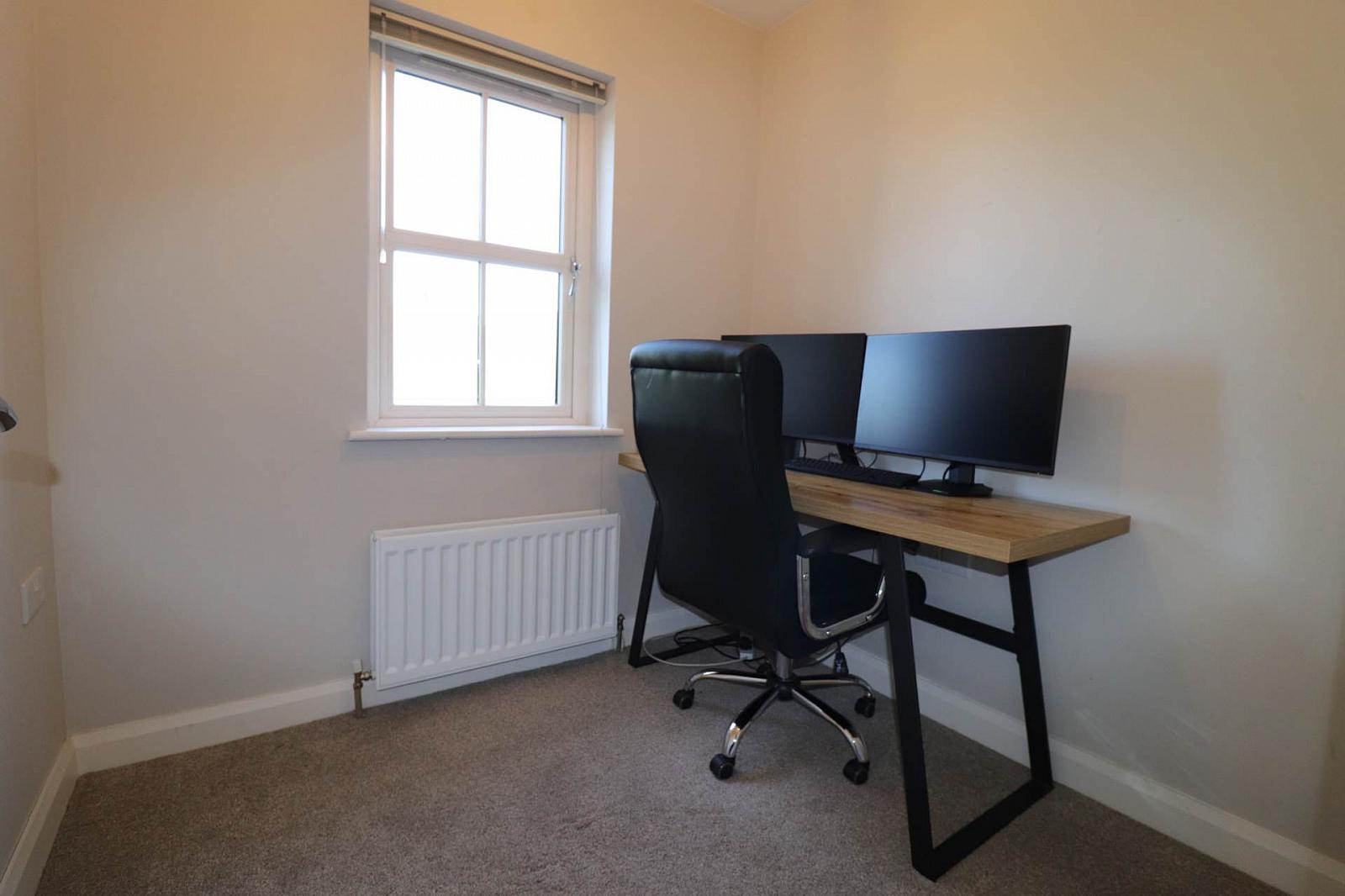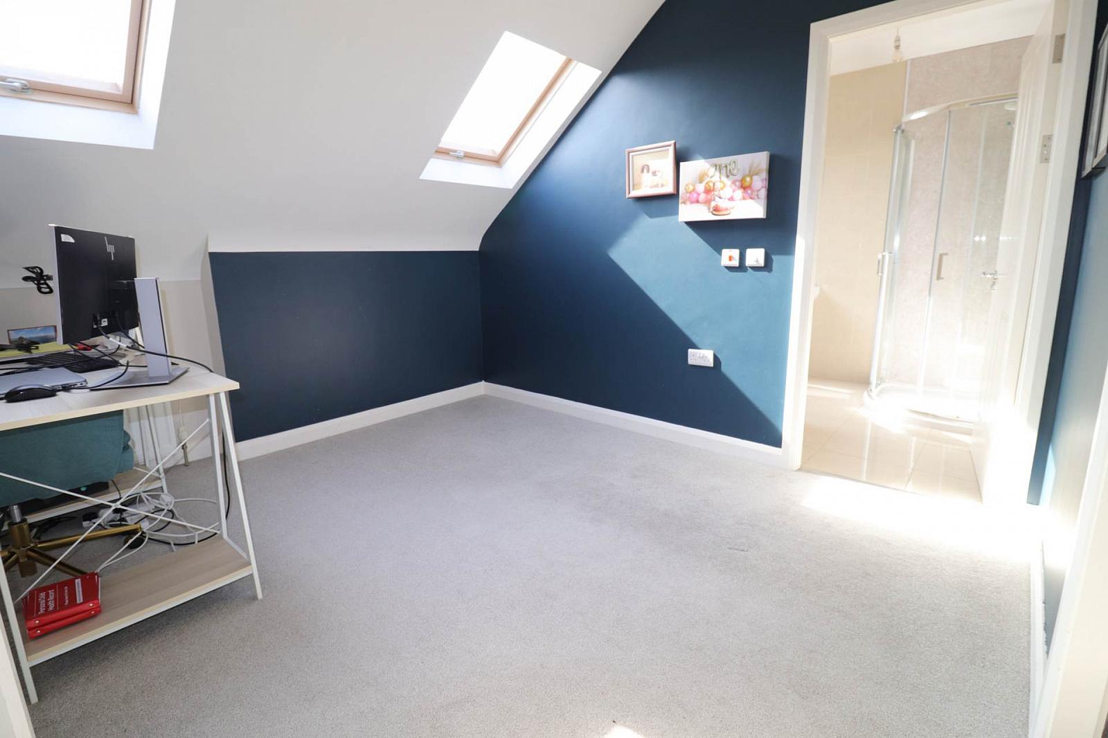 Upstairs, the first floor hosts two generously sized bedrooms, both with ensuite bathrooms, along with a dedicated study or home office, ideal for remote working.