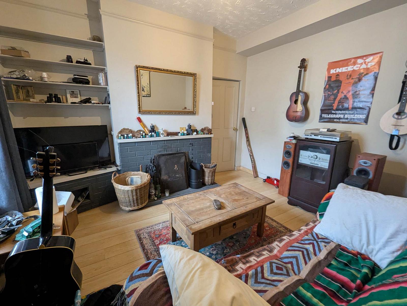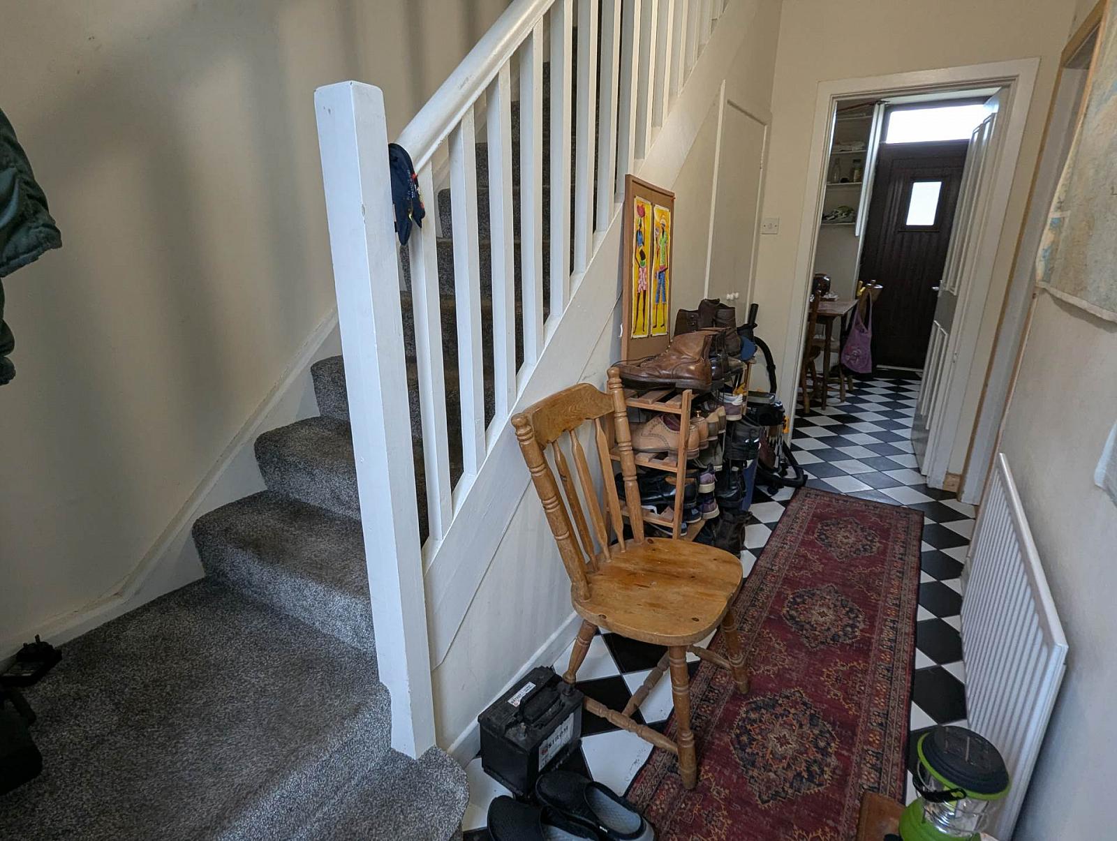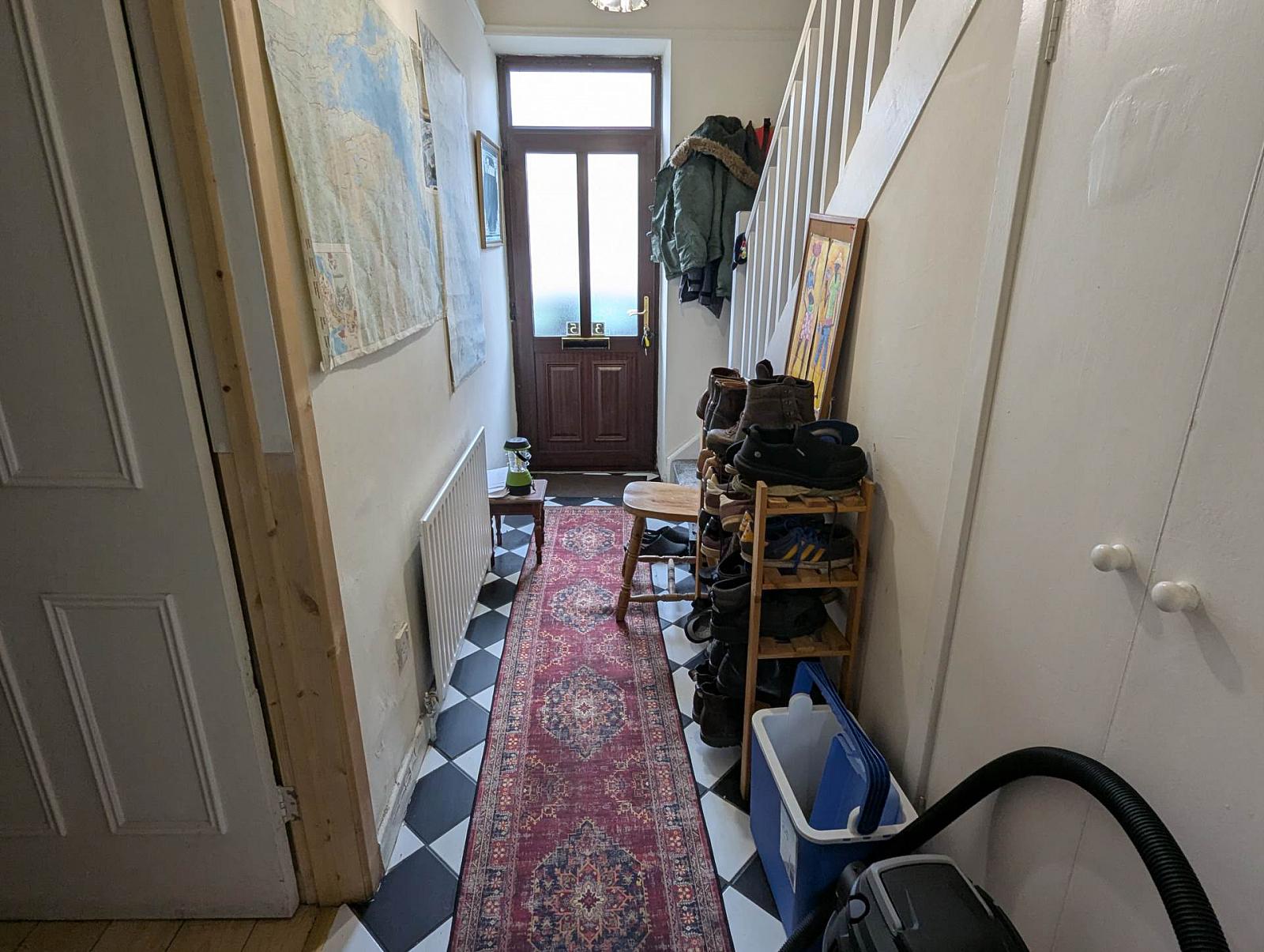 Entrance hallway and front living room with open fire