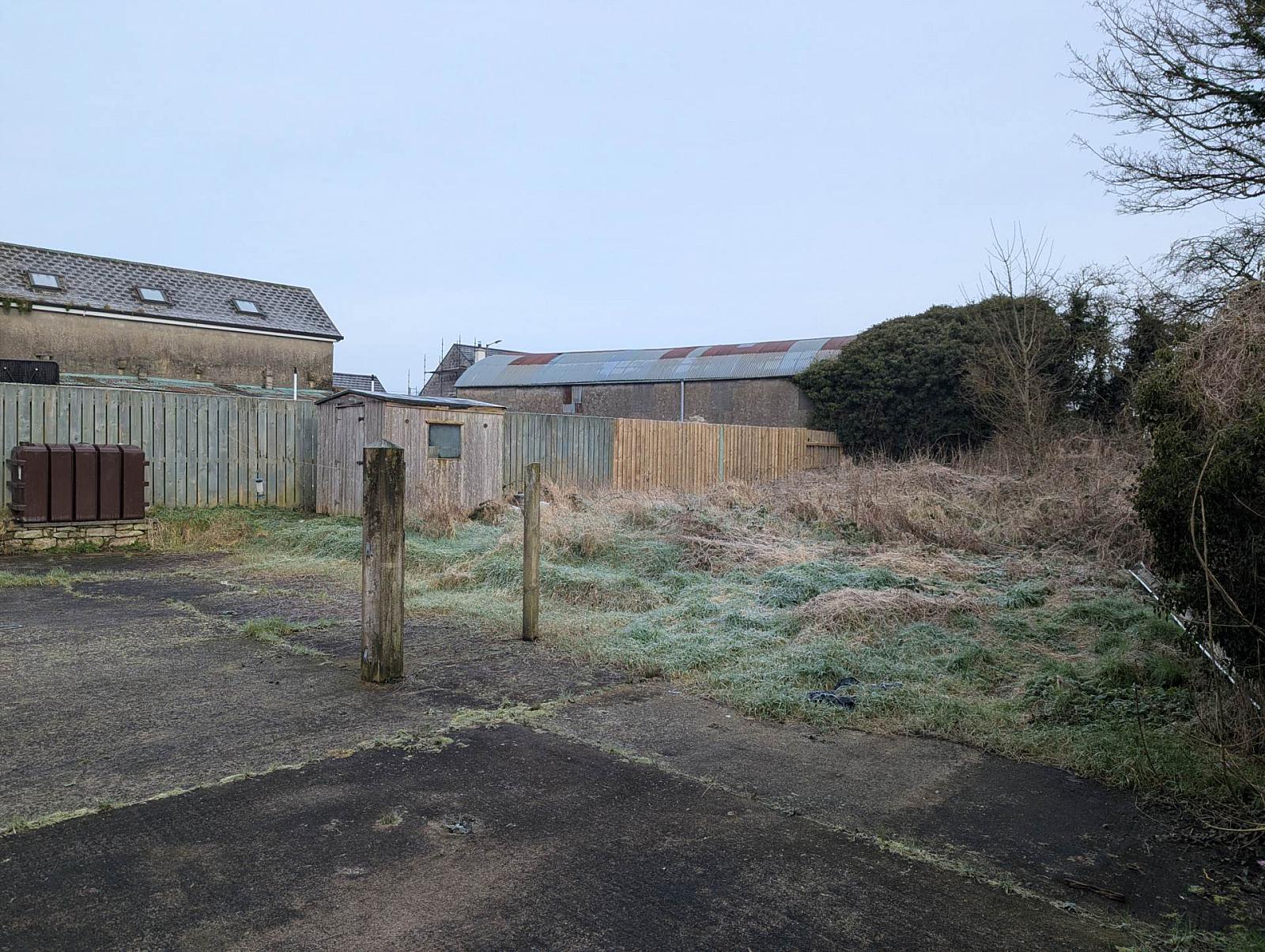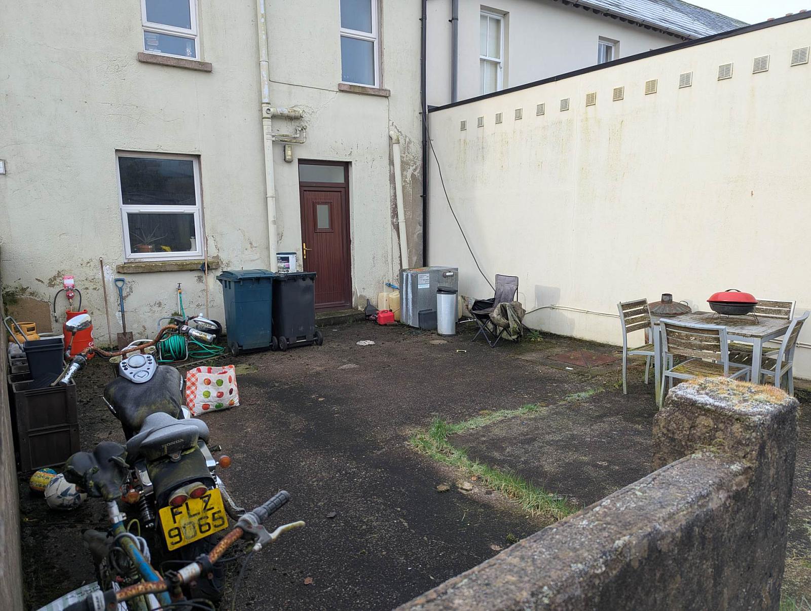 Open rear concrete yard with shed and garden area