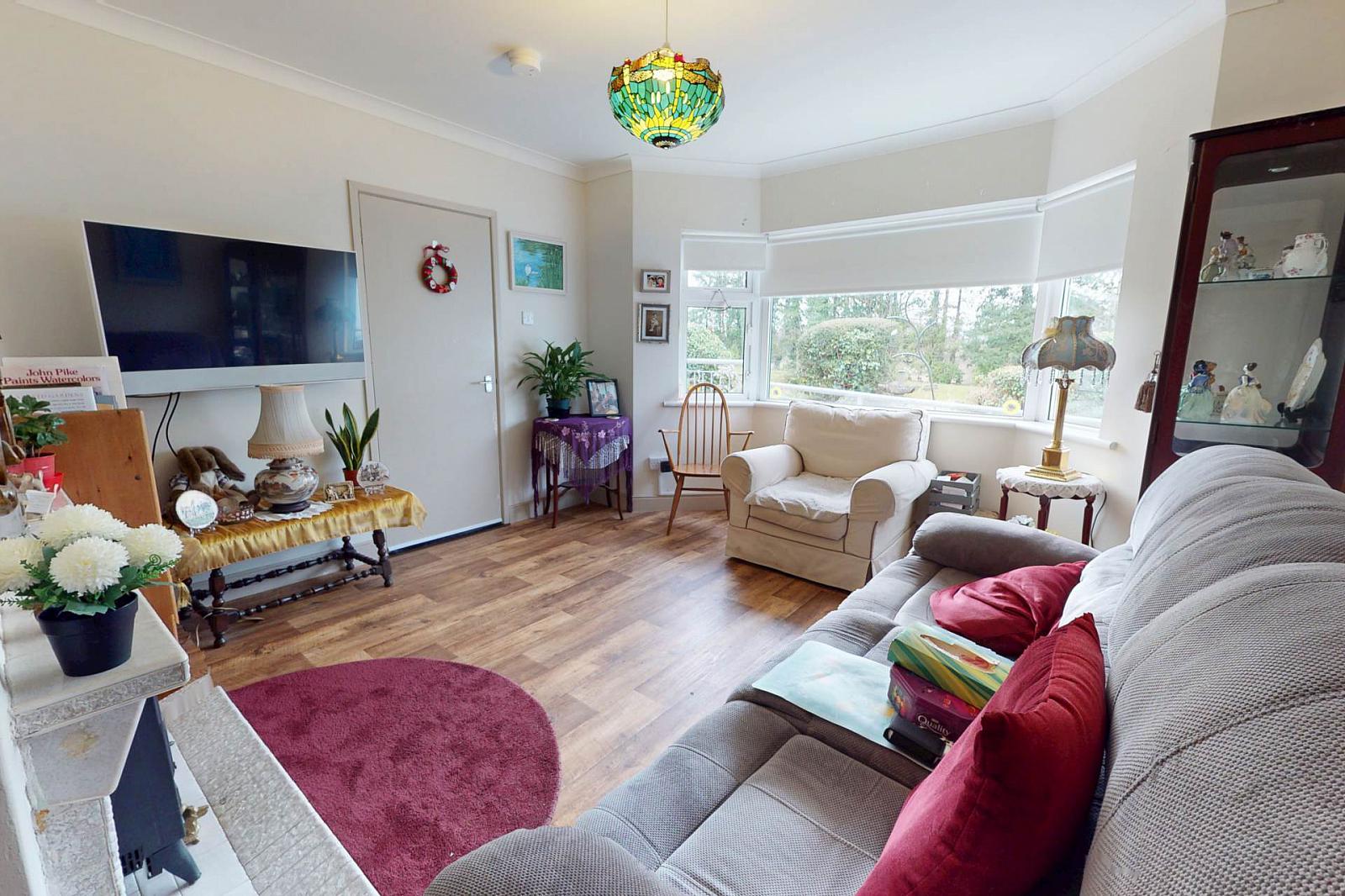 Wooden Effect Vinyl Flooring, TV Point, Fireplace with Tiled Hearth and Surround, Bay Window;