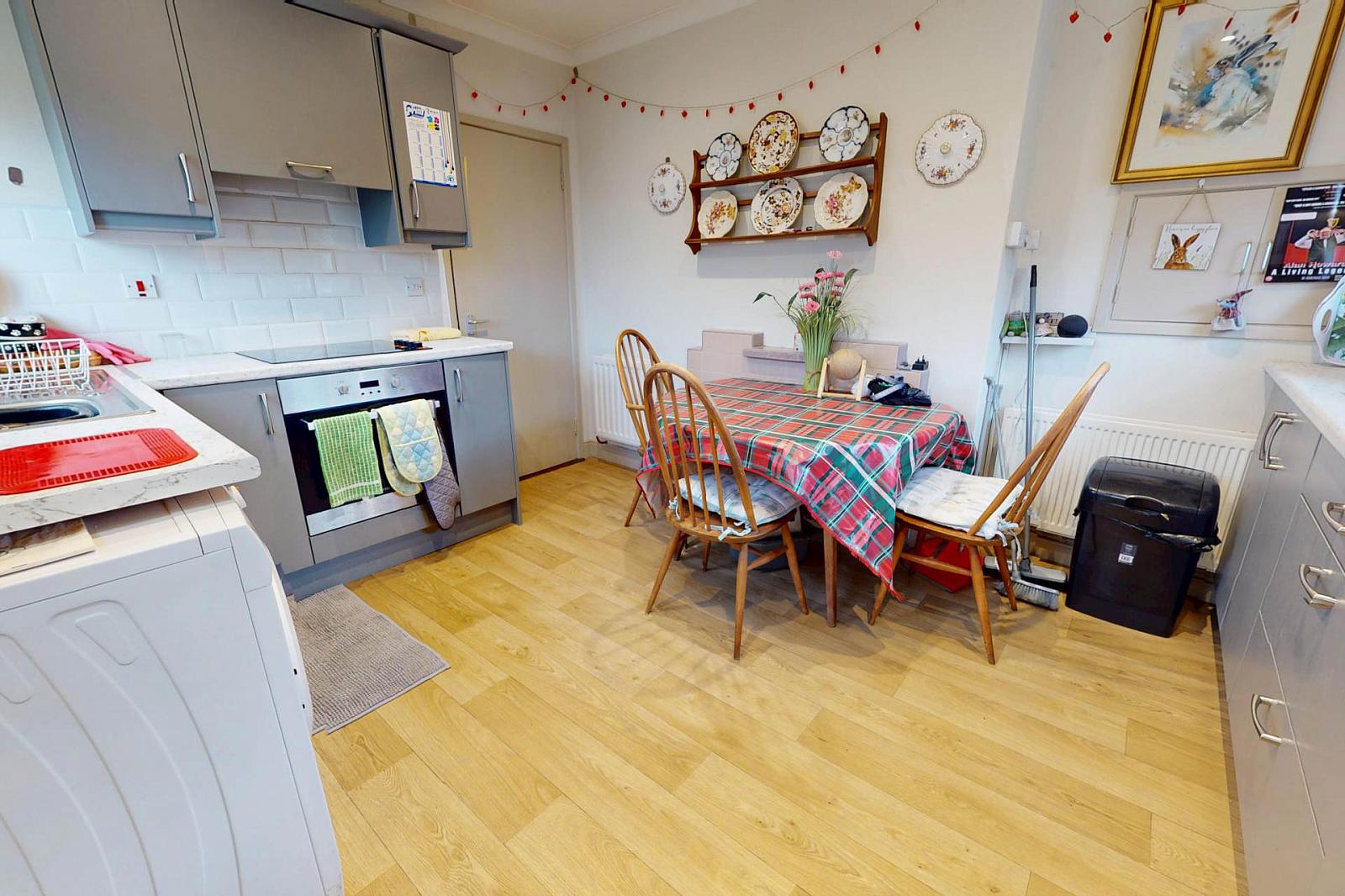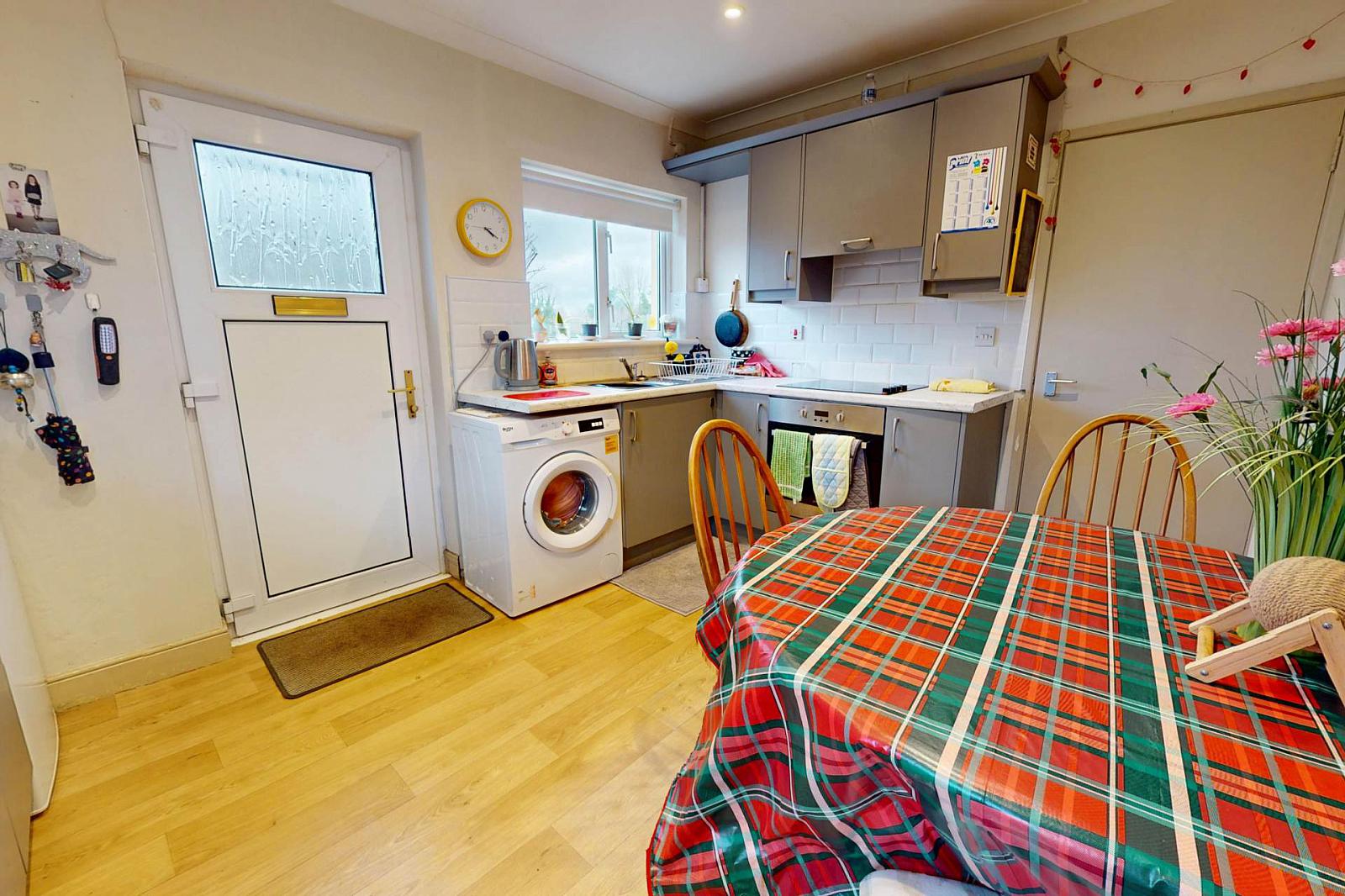 Internally, the home features a welcoming entrance leading to a comfortable living room, complete with a fireplace and large window allowing for excellent natural light. The kitchen is well laid out with modern fitted units, ample worktop space, and direct access to the rear. Both double bedrooms are well-proportioned, offering comfortable accommodation finished with a well maintained bathroom.
