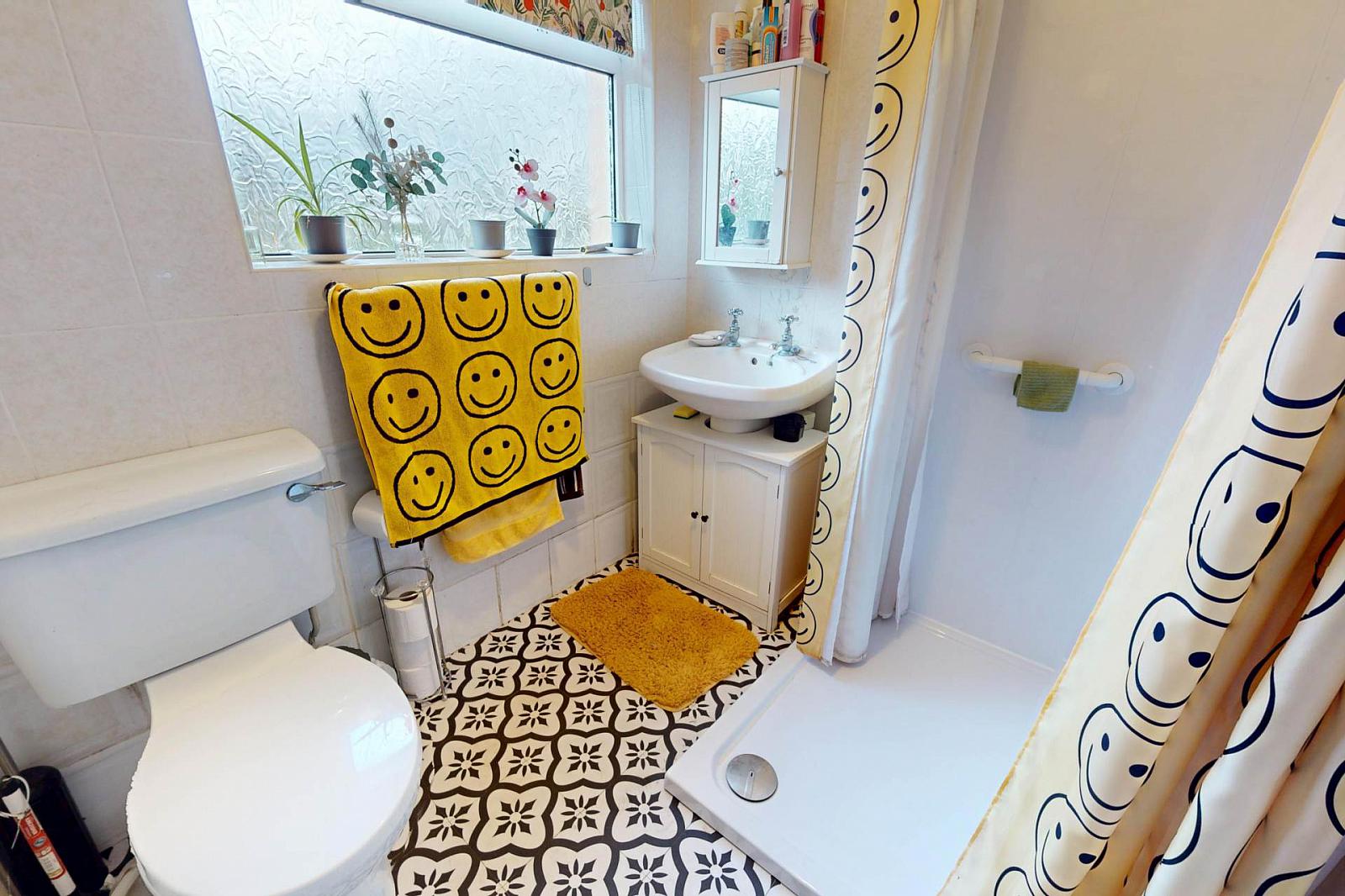 Tiled Effect Vinyl Flooring, Fully Tiled Walls, WC, Wash Hand Basin, Walk-In Power Shower;