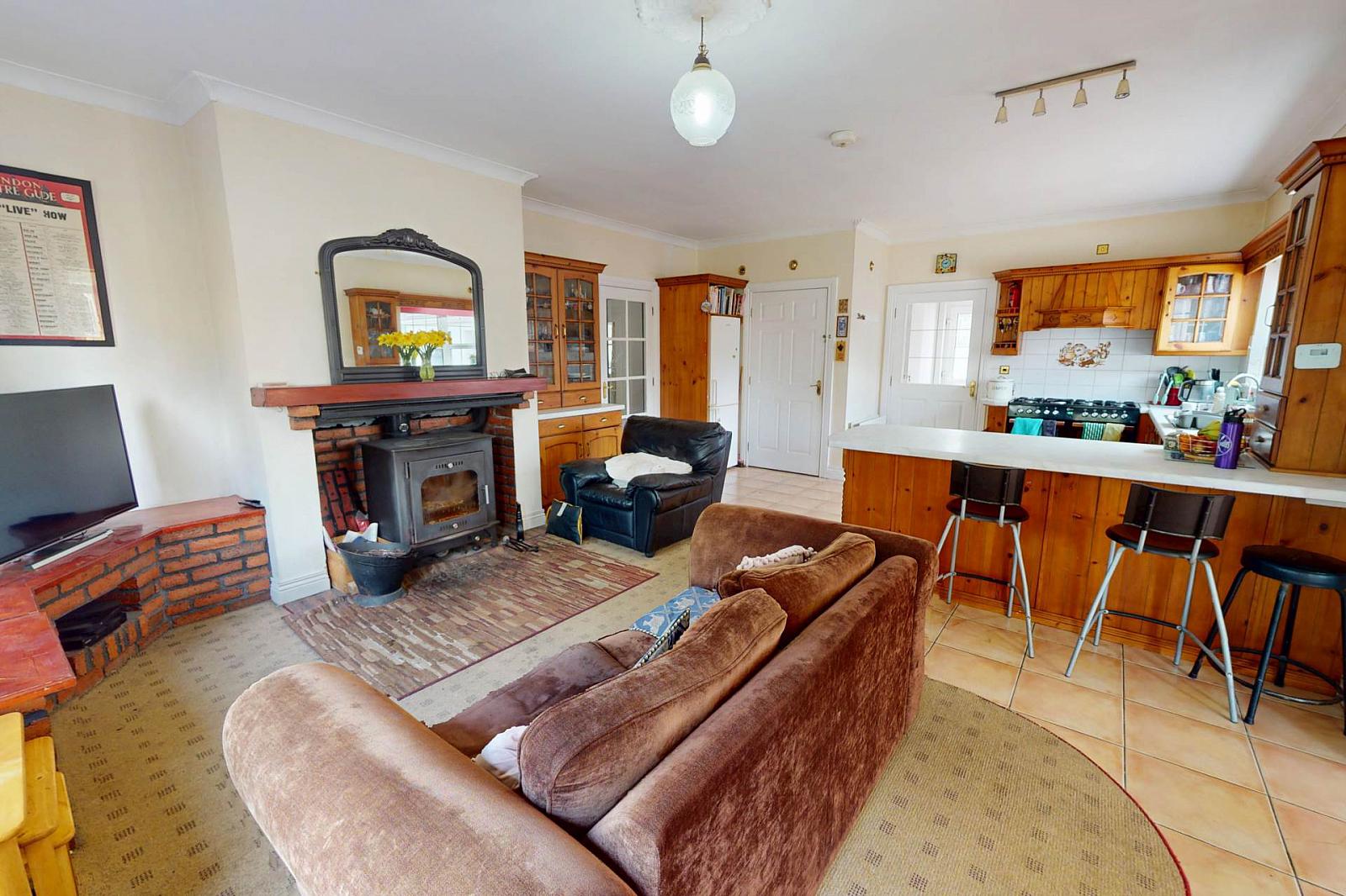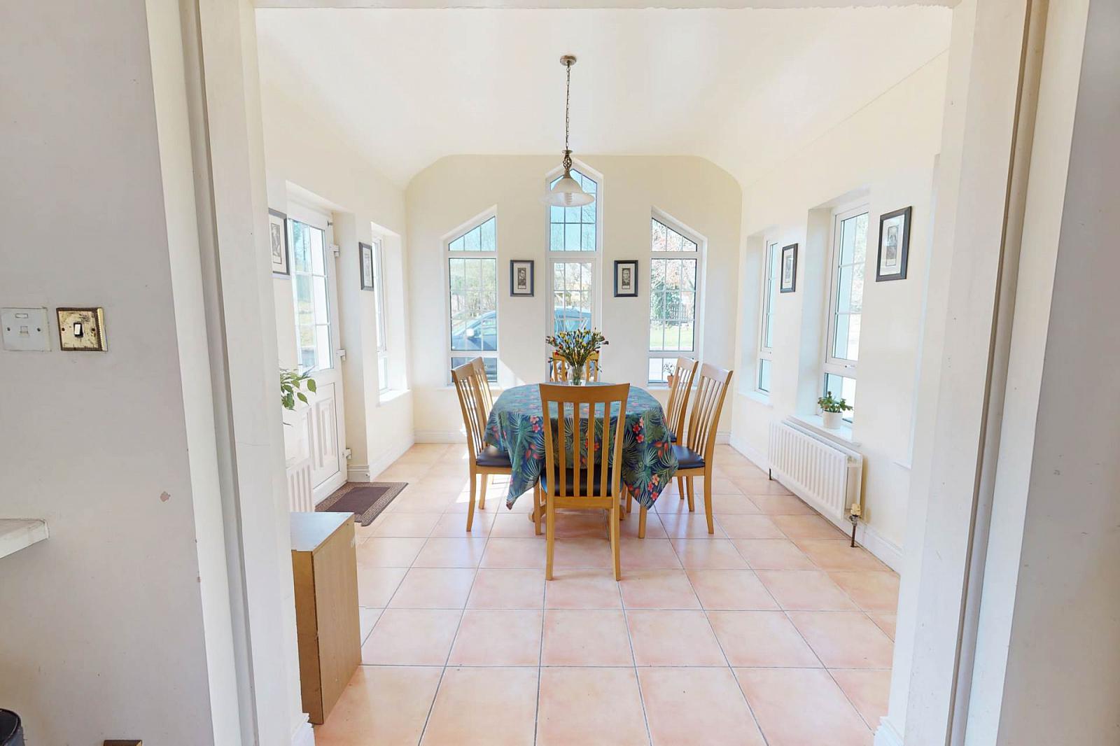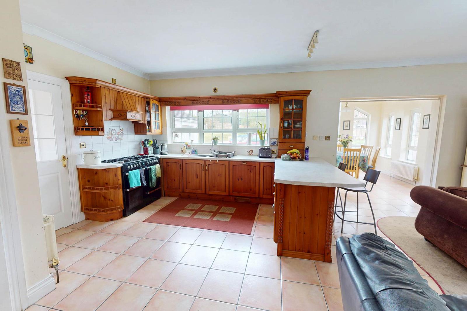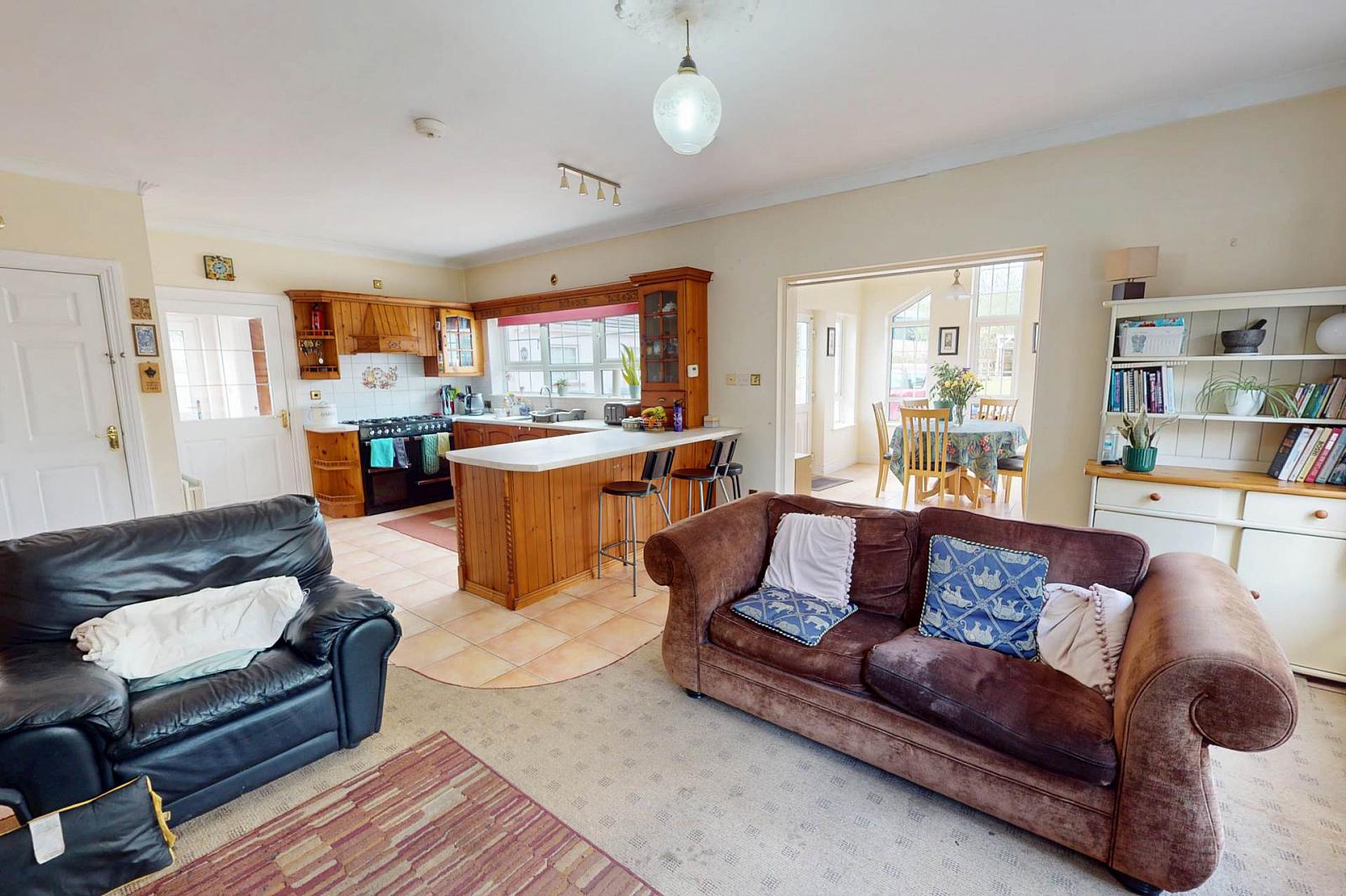 Built in 2000, the home opens into a bright tiled hallway, leading to a spacious living room with cosy carpet and a high-efficiency gas fire. At its heart, an open-plan kitchen and lounge flow into a striking dining area, where arched windows and patio doors fill the space with light and connect to the rear yard.