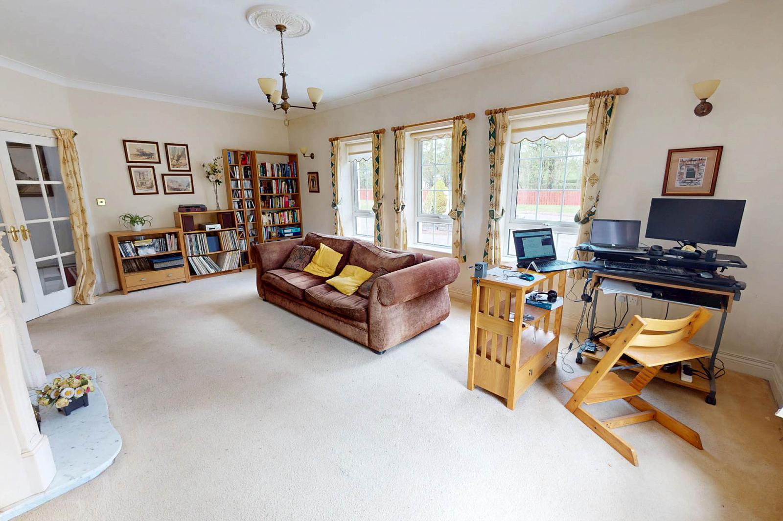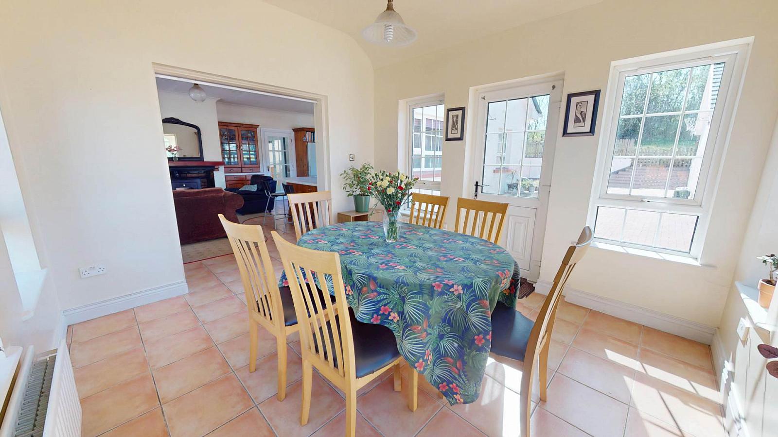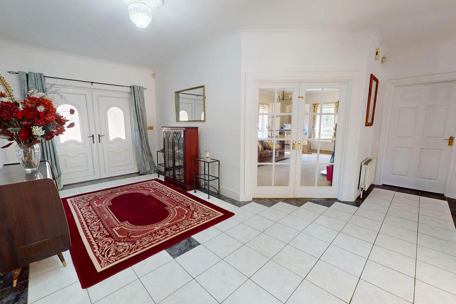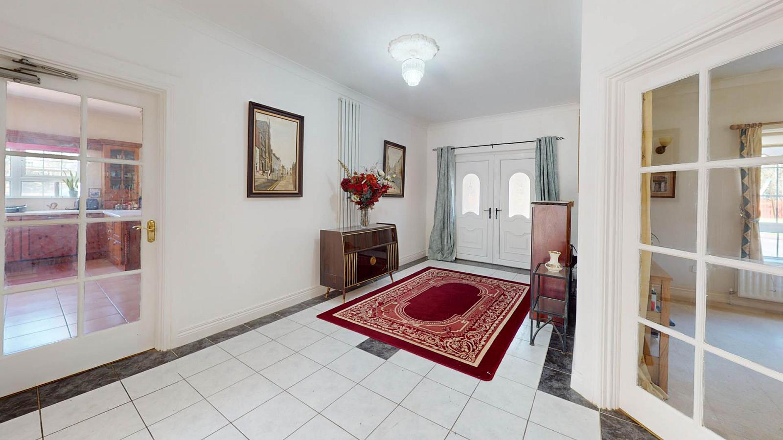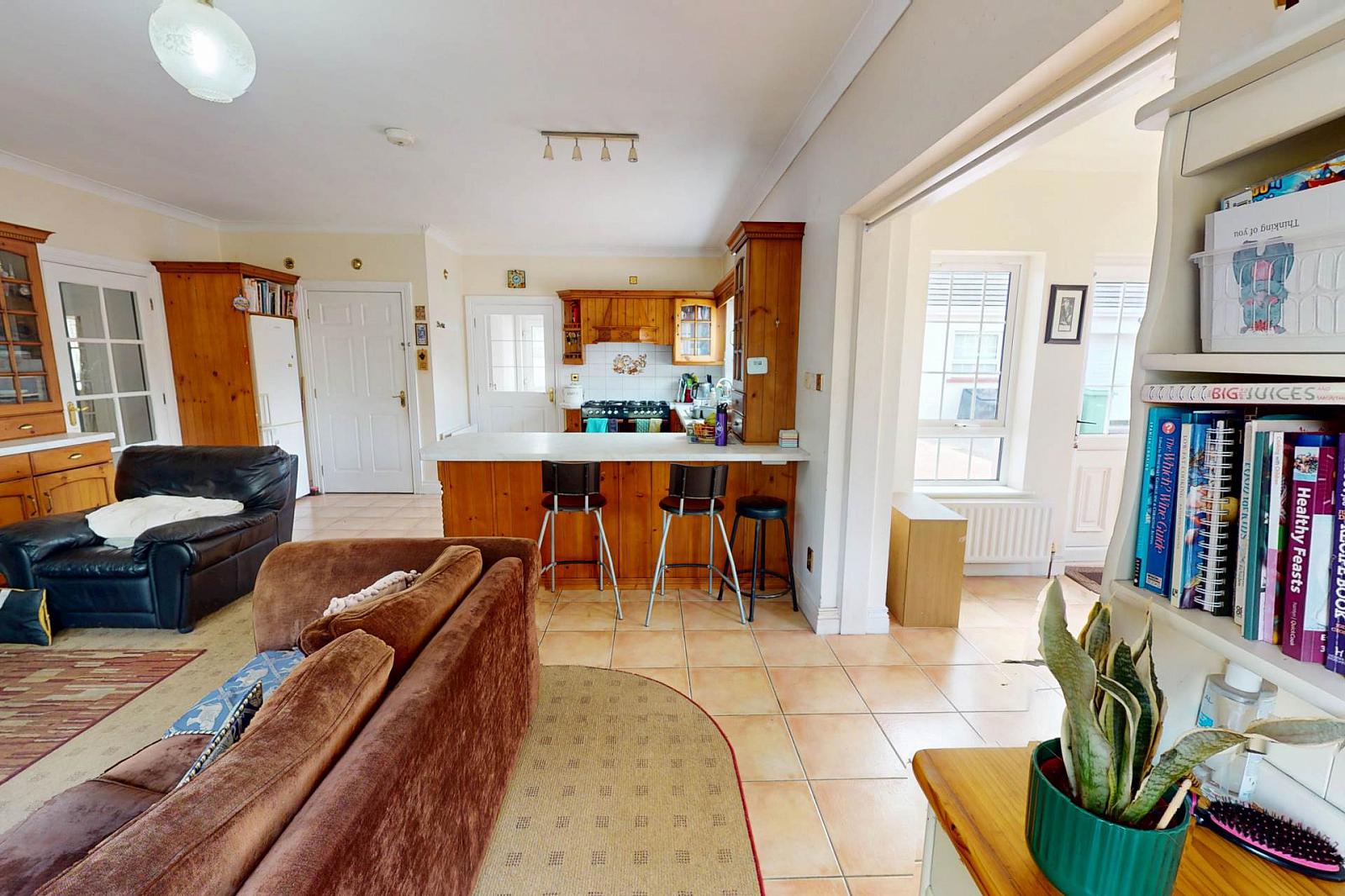 Built in 2000, the home opens into a bright tiled hallway, leading to a spacious living room with cosy carpet and a high-efficiency gas fire. At its heart, an open-plan kitchen and lounge flow into a striking dining area, where arched windows and patio doors fill the space with light and connect to the rear yard.