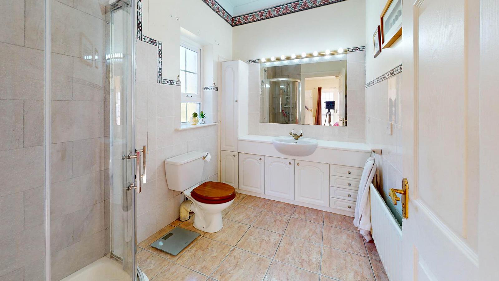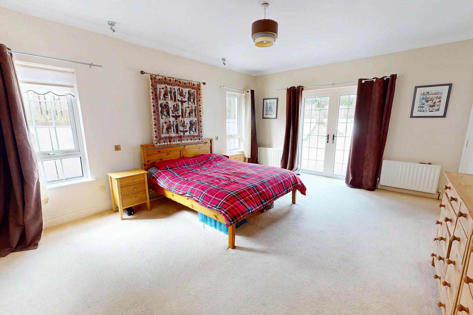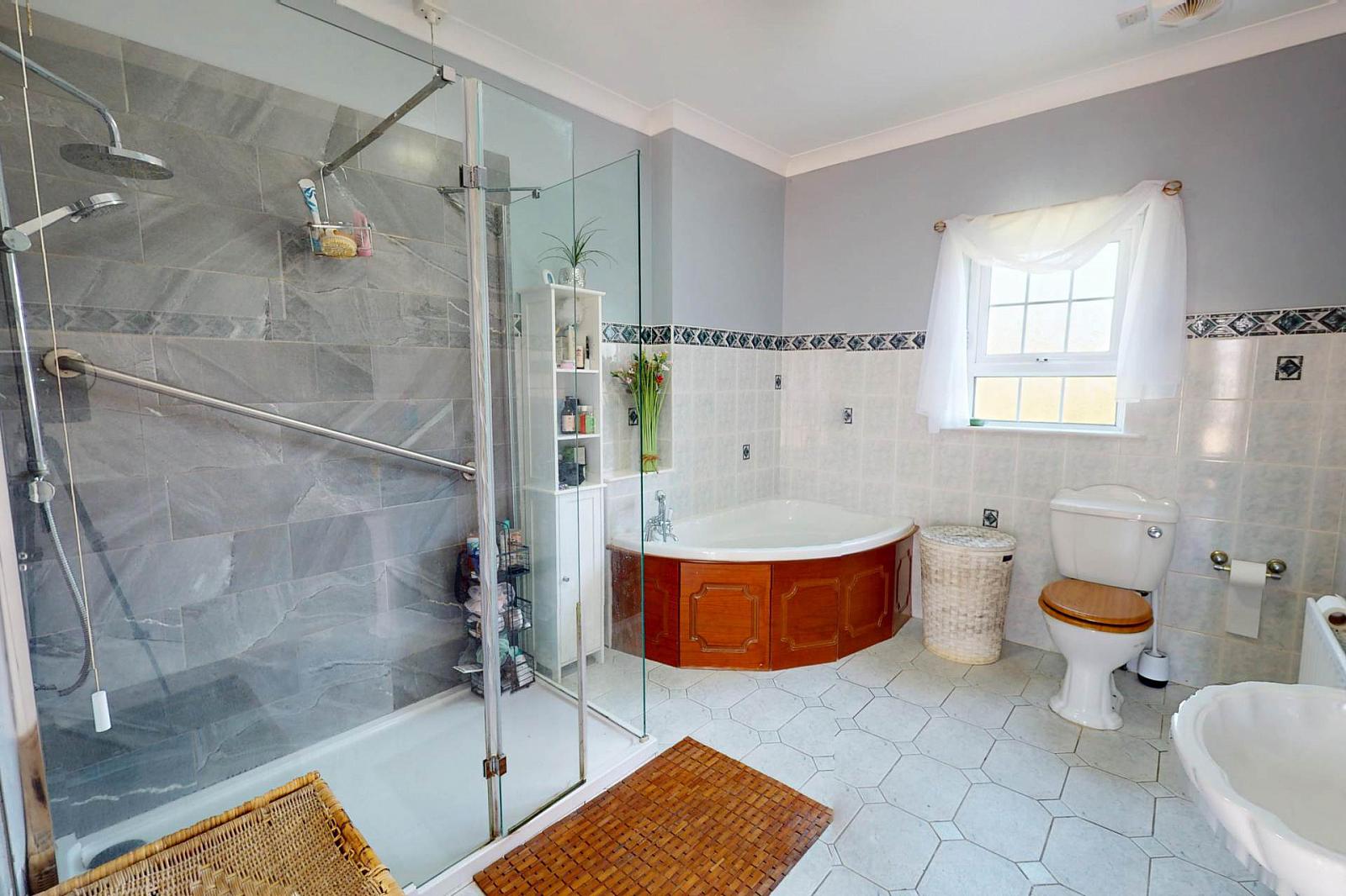 There are four generous bedrooms, including a standout rear suite with double patio doors ideal as guest accommodation or a second living space. The main bedroom features patio access, a walk-in wardrobe, and a stylish ensuite. The main bathroom is fully tiled and fitted with a double mains-pressure shower via the thermal heat store.