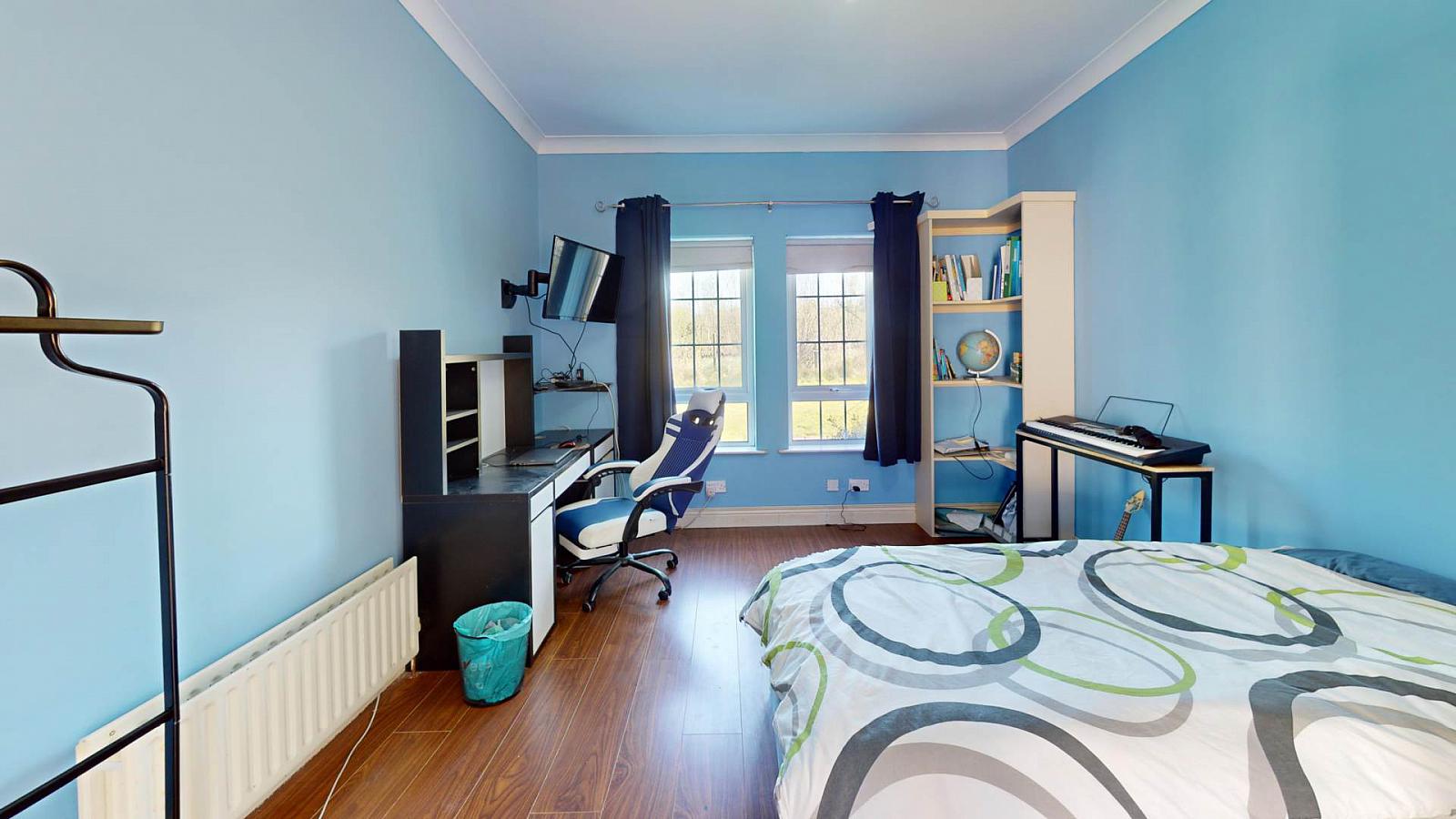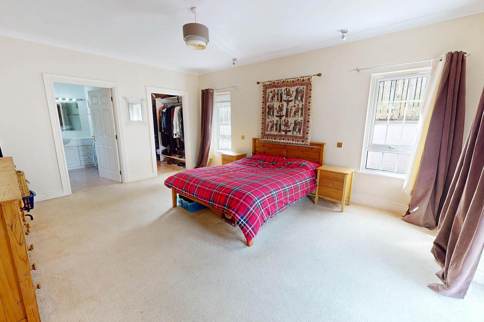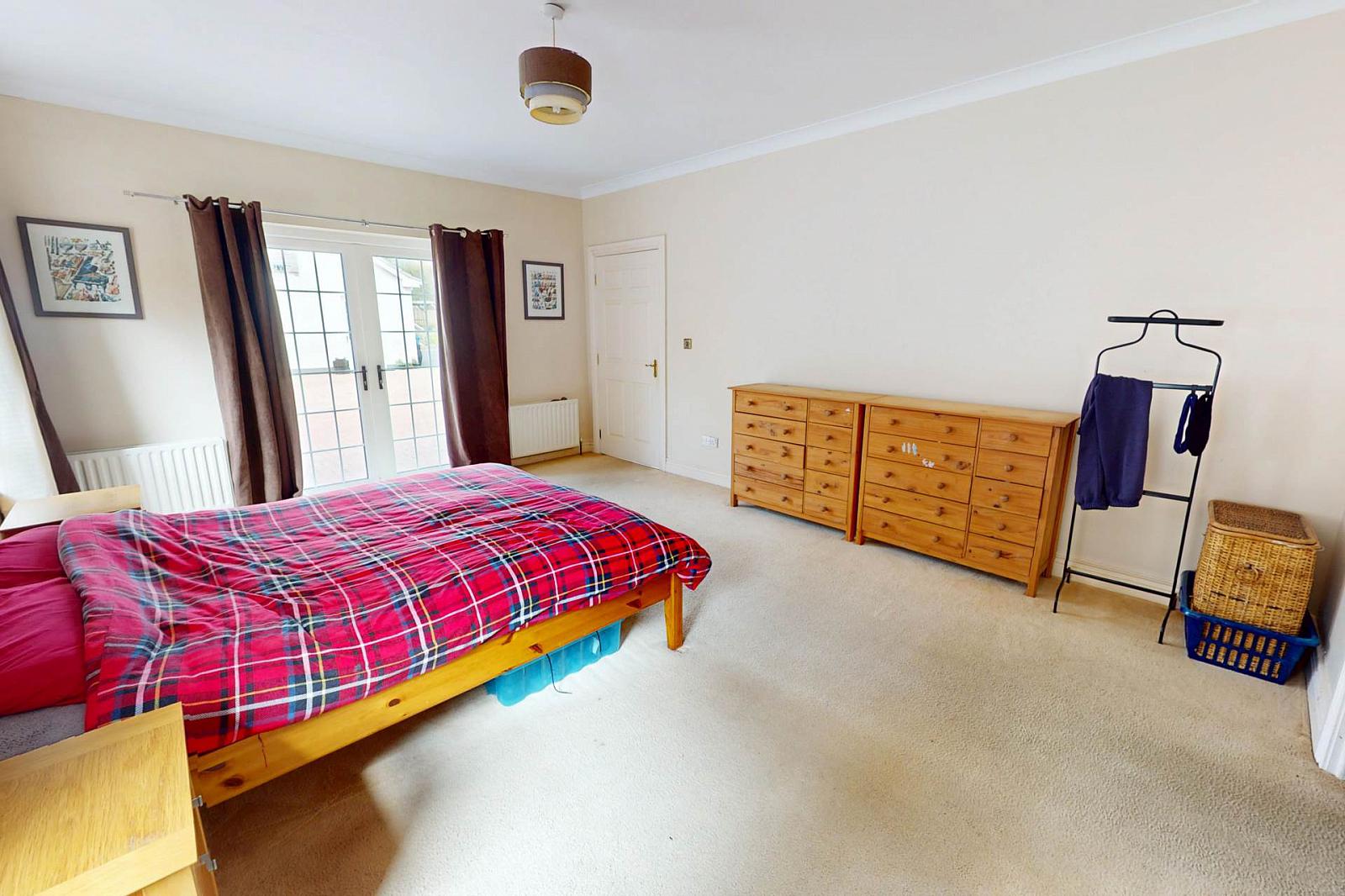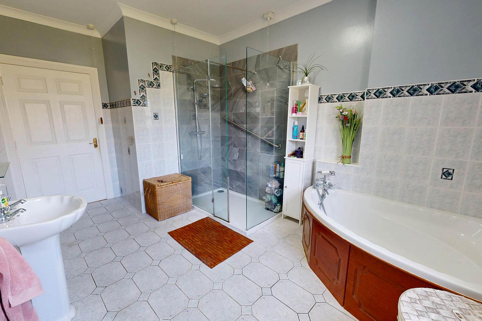 There are four generous bedrooms, including a standout rear suite with double patio doors ideal as guest accommodation or a second living space. The main bedroom features patio access, a walk-in wardrobe, and a stylish ensuite. The main bathroom is fully tiled and fitted with a double mains-pressure shower via the thermal heat store.