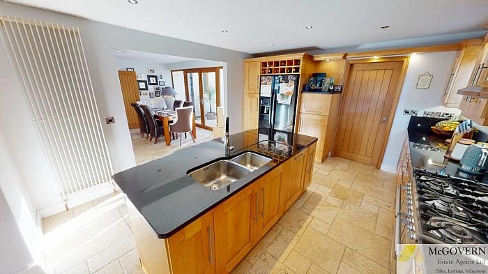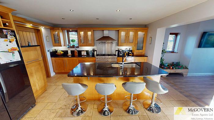 Fully Fitted Oak Kitchen with High and Low Level Units, Marble Flooring, Granite Worktops, Island with Franke Sink Unit, Granite Splashback, Extractor Fan, American Firdge/Freezer Unit, Large Range Stainless Steel Cooker, Dishwasher Unit, Down-Lighting;