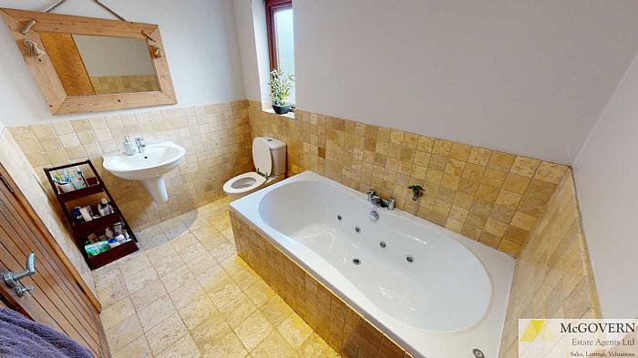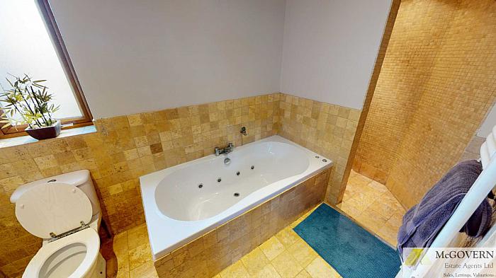 Tiled Flooring, Part Tiled Walls, WC, Wash Hand Basin, Jacuzzi Bath, Walk-In Shower, Down-Lighting, Heated Towel Rail;
