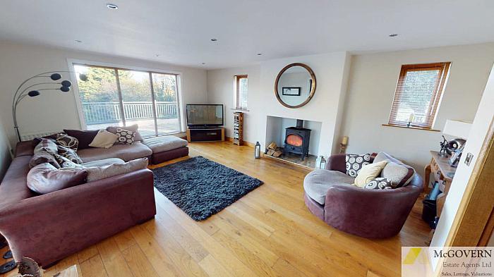 Solid Wooden Flooring, Wood Burning Stove, Tiled Hearth, TV Point, Down-Lighting, Sliding Patio Doors to Patio Area;