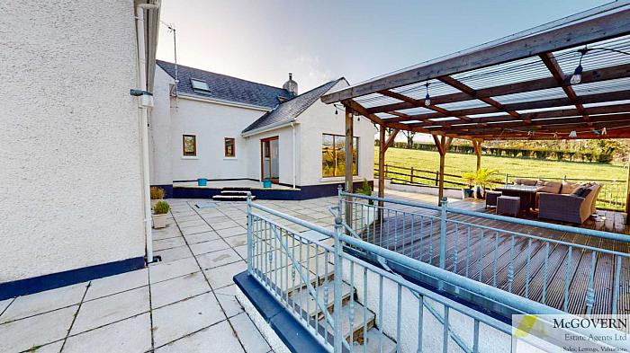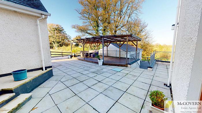 Paved area with begola providing an ideal place to relax and entertain, detached garage with roller shutter door, Tarmac Driveway with Off Street Parking, Enclosed with Mature Shrubs and Hedging;