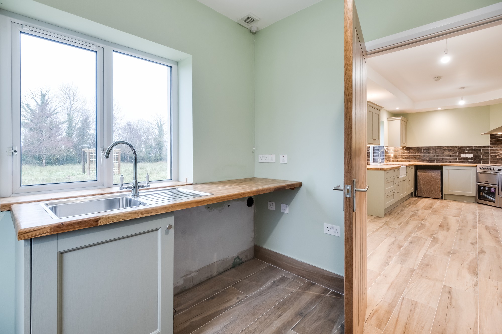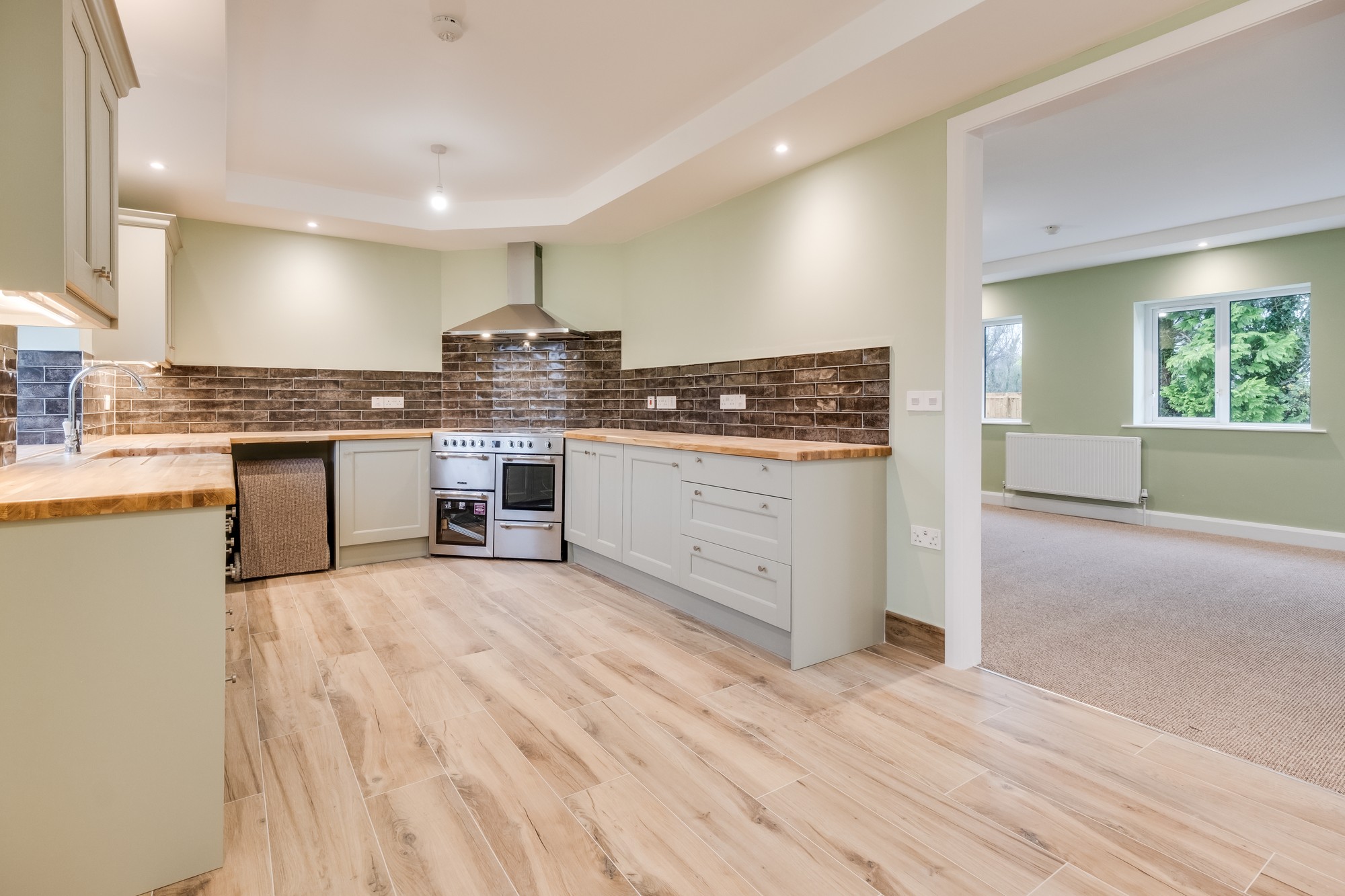 Luxury fitted shaker style kitchen with a range of high & low level units, wooden work top, ceramic double sink, range cooker, extractor fan, plumbed for dishwasher, space for fridge, tiled floor.