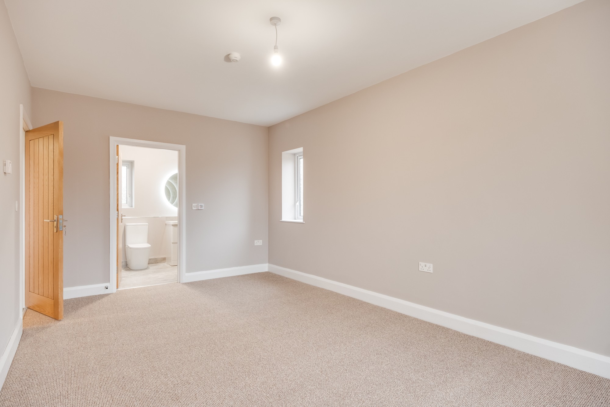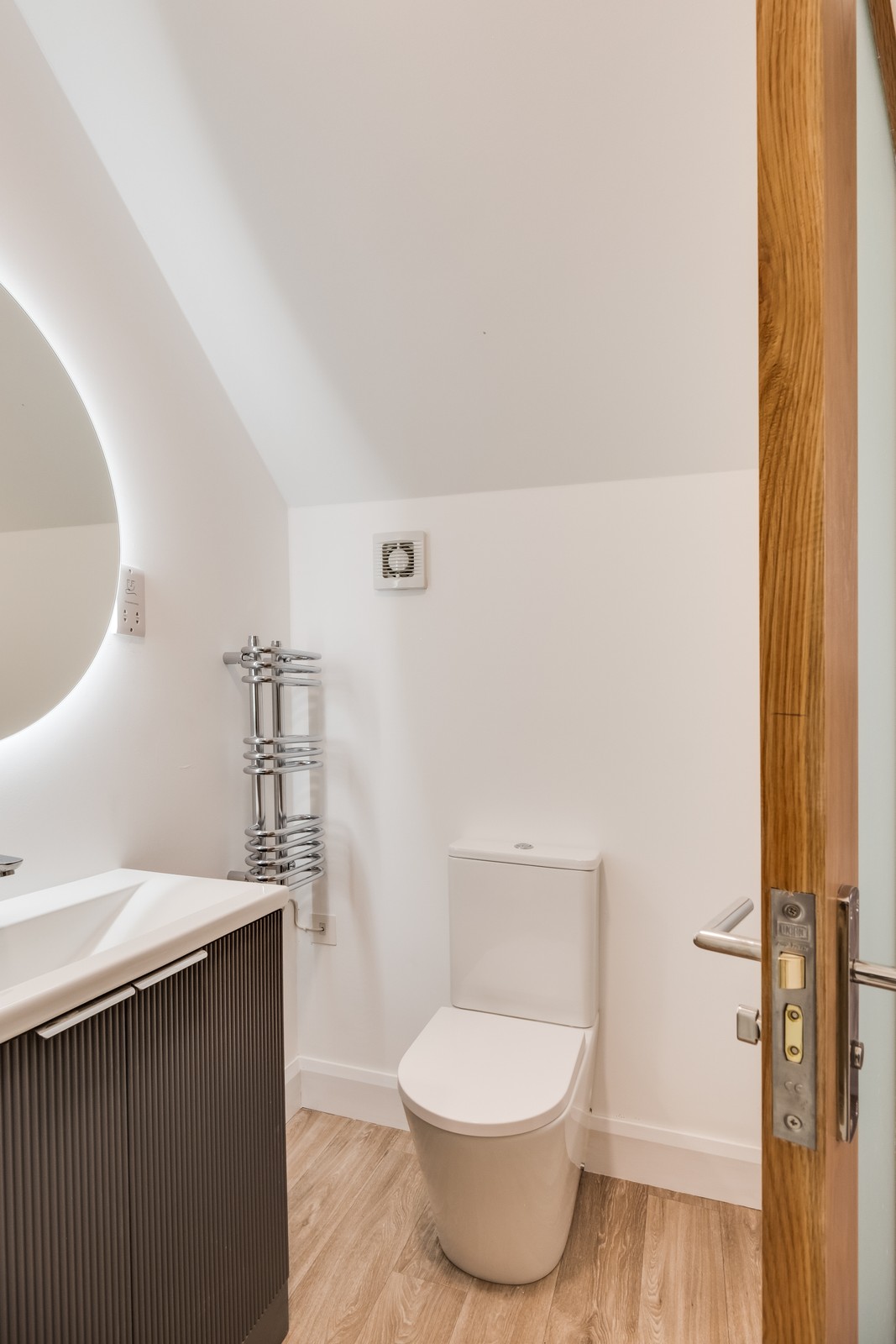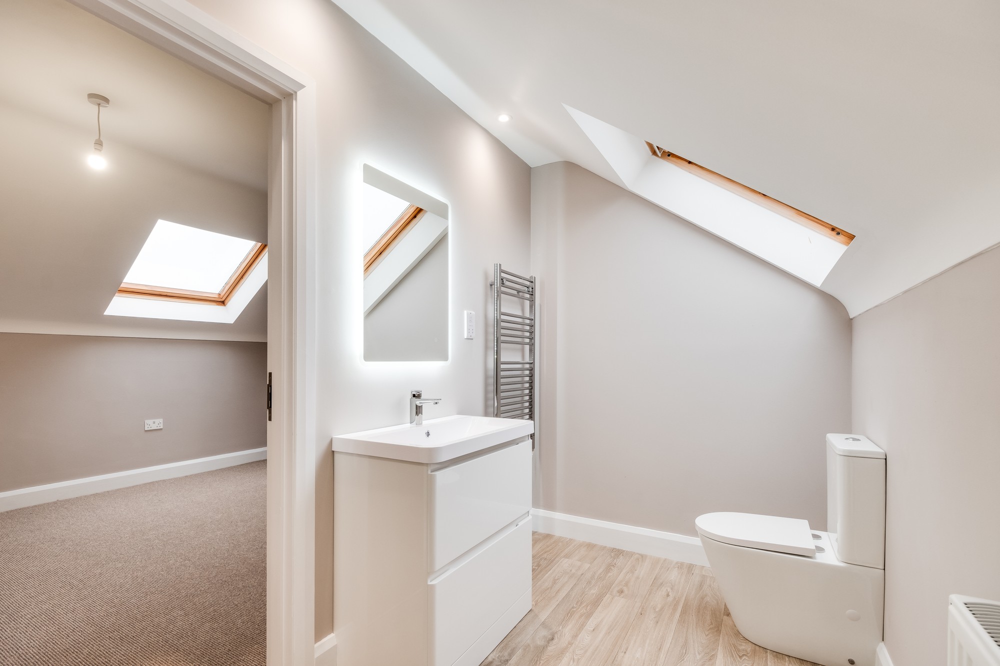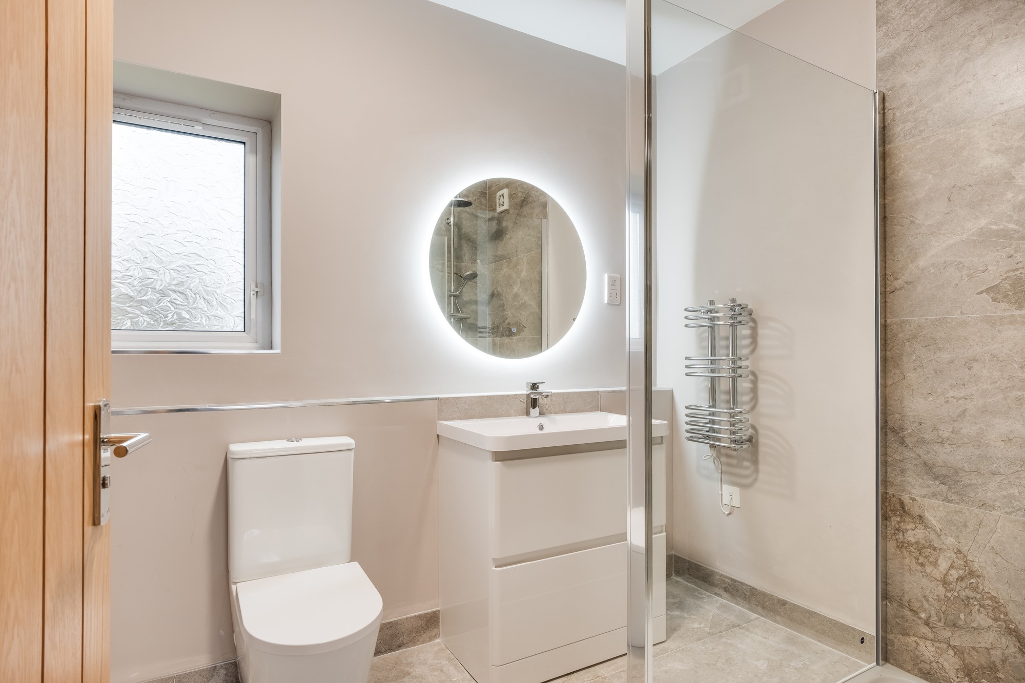Contemporary suite, step-in shower, vanity unit, heated towel rail.