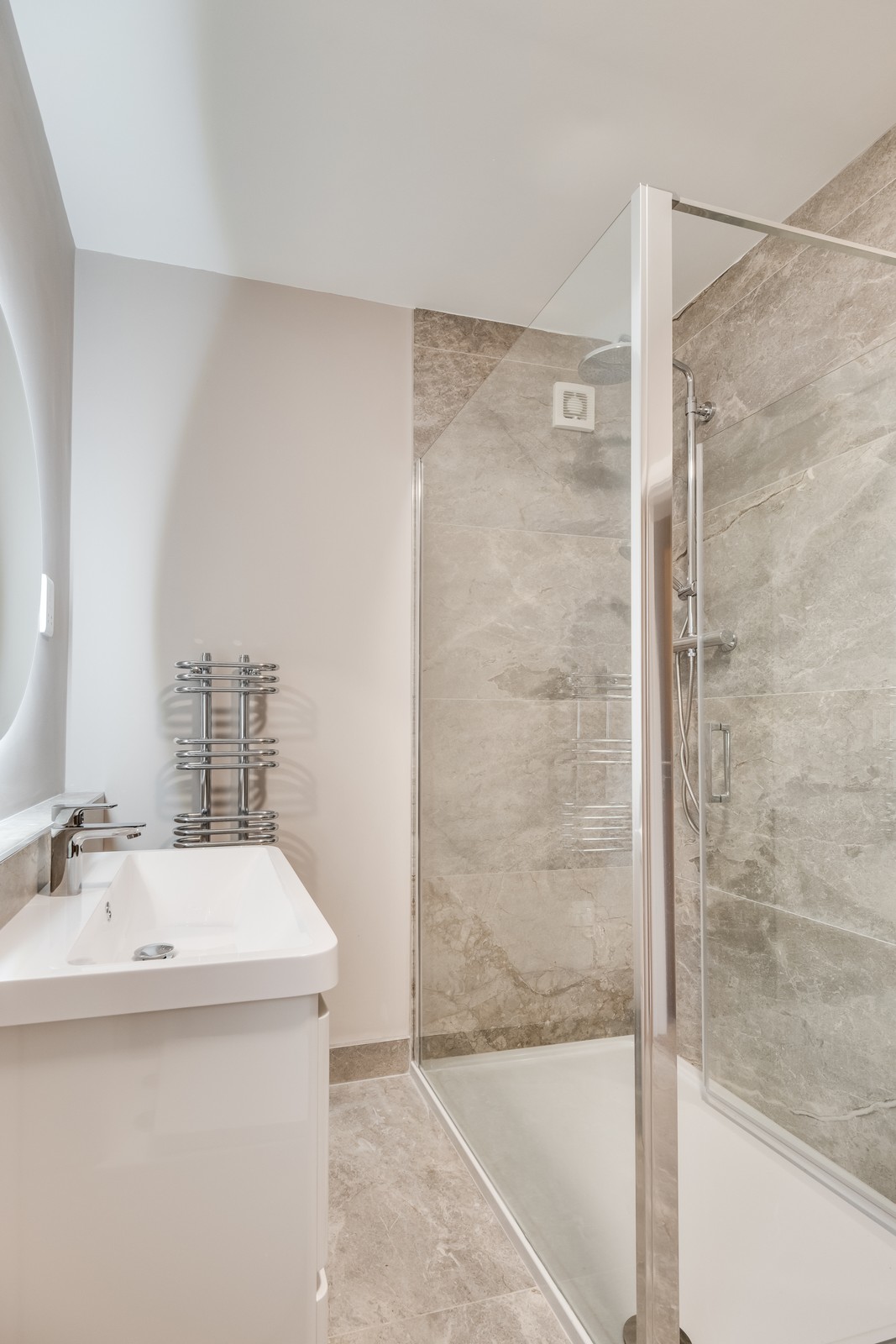 White contemporary suite with bath, step-in shower cubicle, vanity unit, tiled floor, tall radiator and LED lighting.