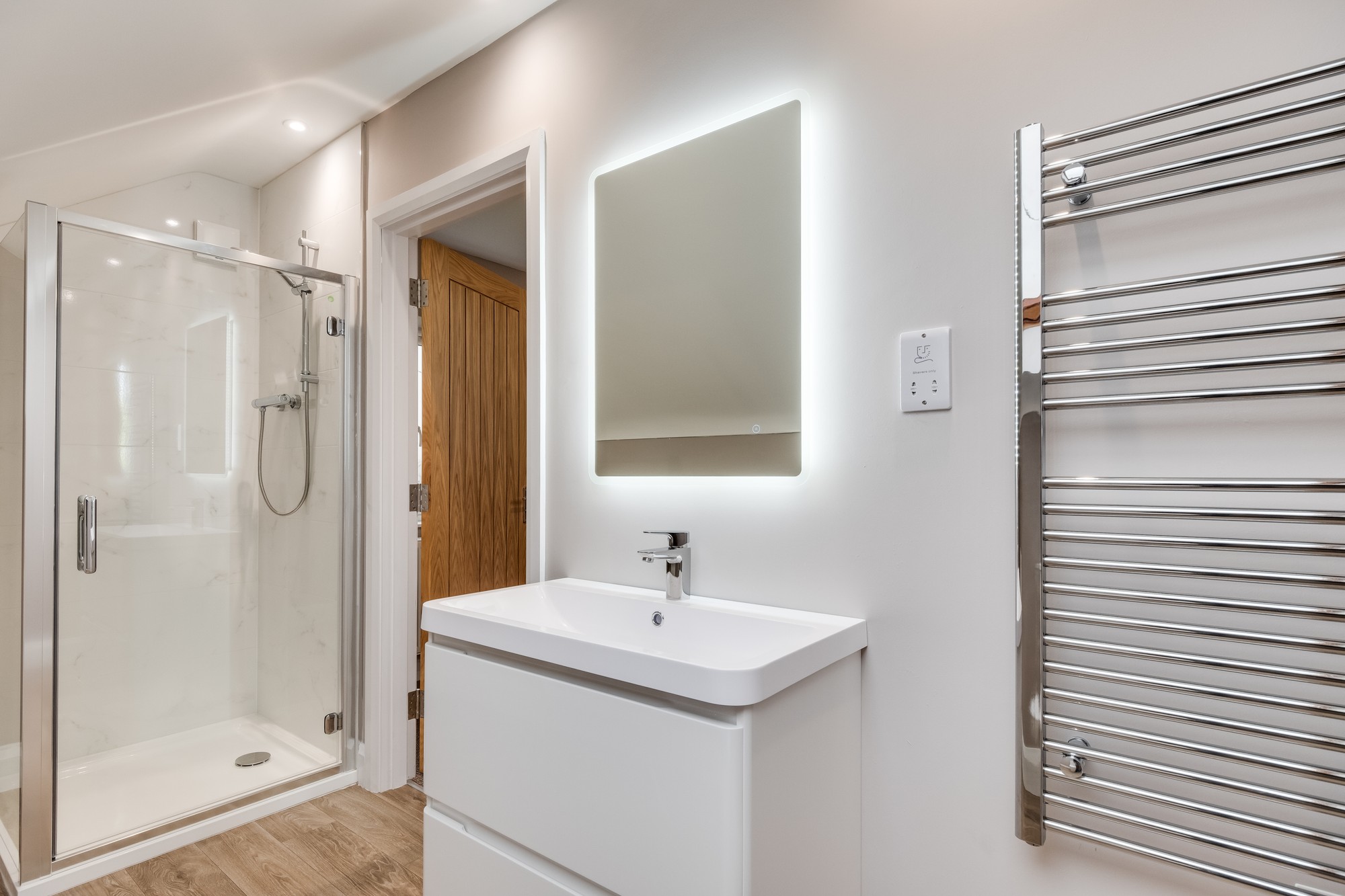 Contemporary suite, step-in shower, vanity unit, tiled surround, LED mirror, heated towel rail.