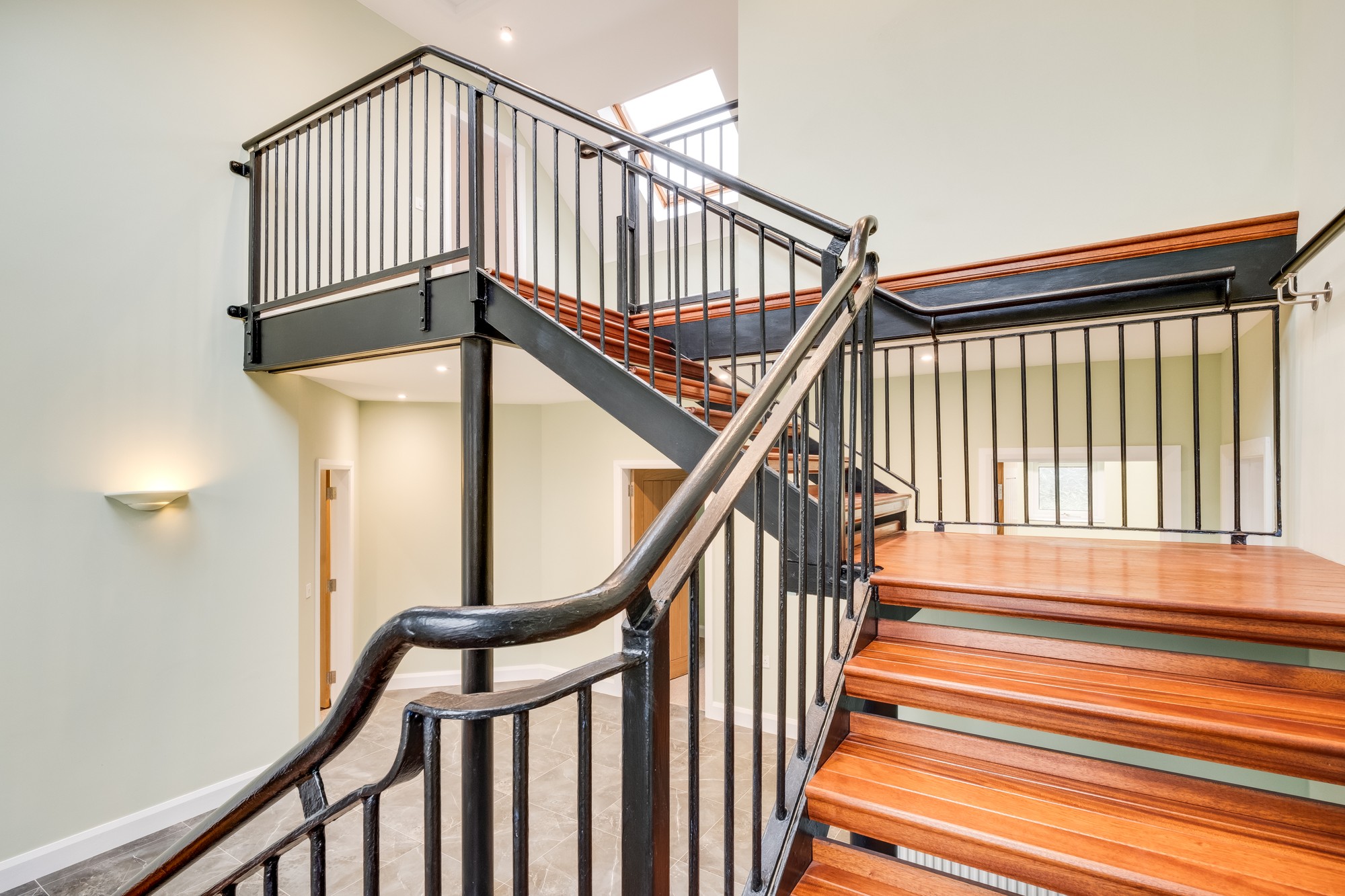 PVC exterior door with glazed feature inset and side screens, fan light window, bespoke wrought iron staircase with bespoke stair threads made from West African Mahogany.