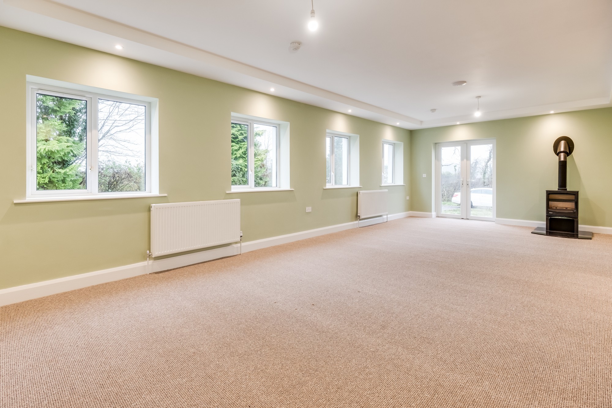 Multi fuel stove, double patio doors to garden, feature indented ceiling with drop lighting.