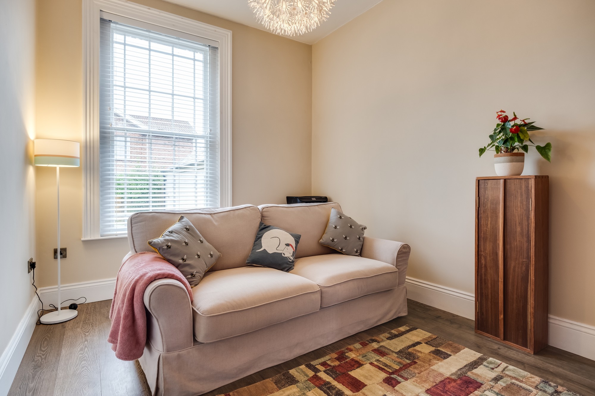 Feature corner window with views towards the River Erne & local townscape, laminate flooring.