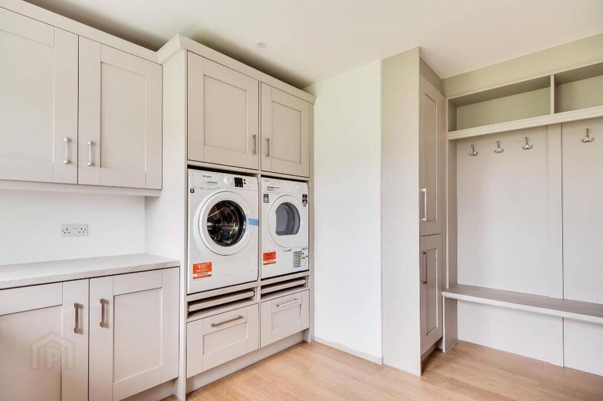 Range of high & low level units, cloaks area with hanging space & bench, washing machine & tumble dryer included, stainless steel sink unit, PVC exterior door with glazed inset, laminate flooring, recessed lighting.