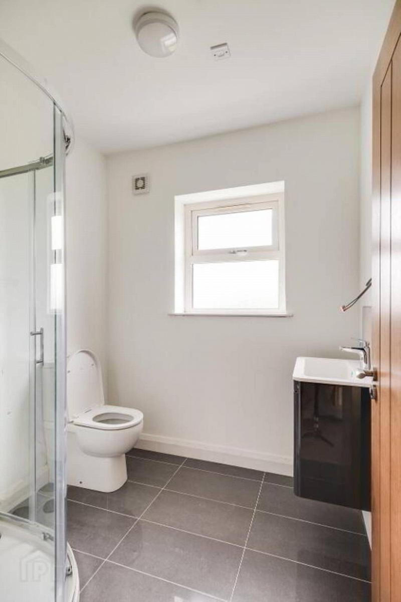 White suite, corner shower cubicle, vanity unit, heated towel rail, tiled floor & splash back