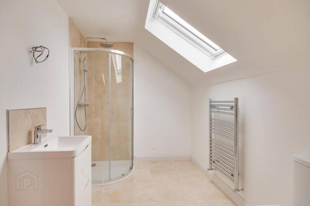 Contemporary white suite, centred bath, vanity unit, corner shower cubicle with thermostatically controlled shower, tiled floor & splash back, heated towel rail.