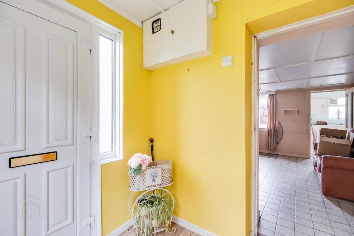 PVC exterior door, panelled ceiling, glazed door to Living Room.