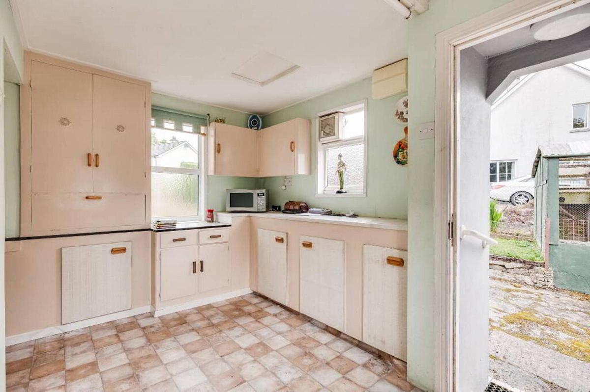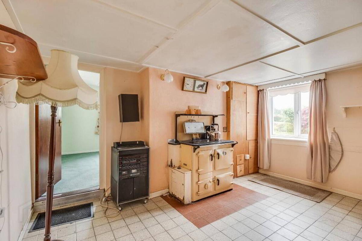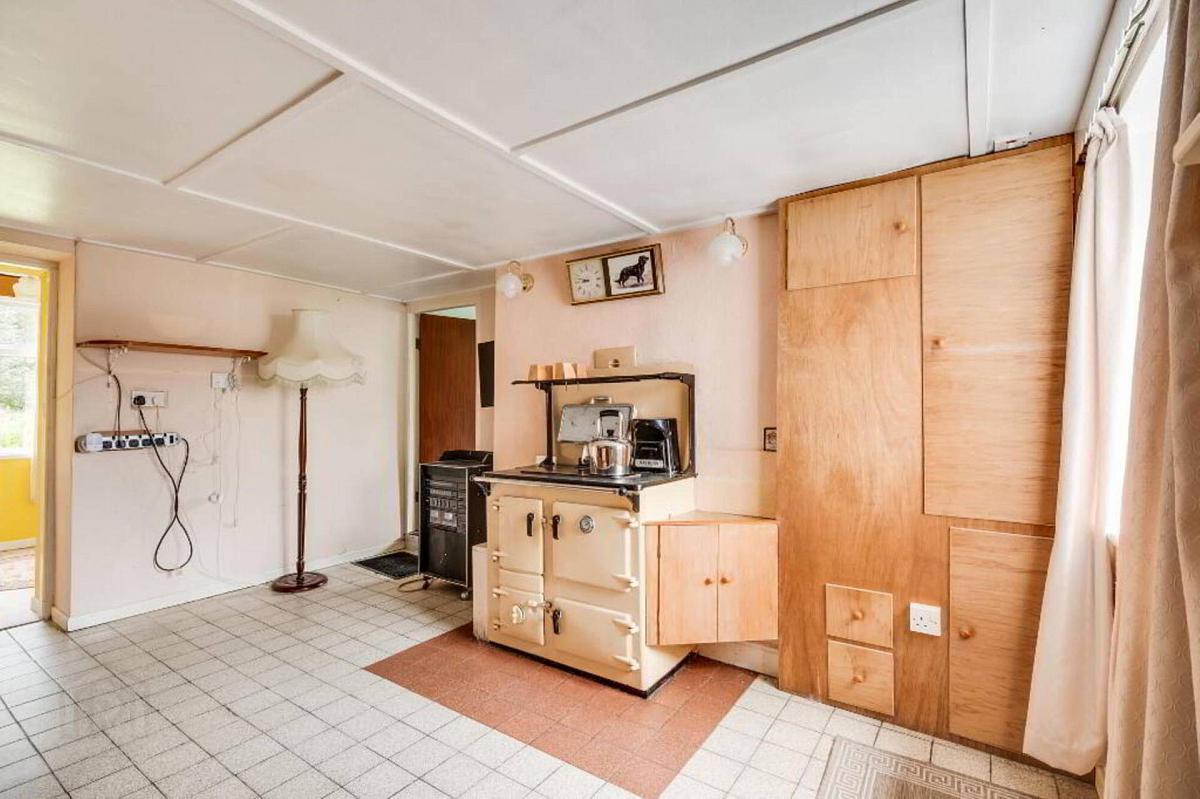 Oil fired range cooker, tiled floor, staircase, under stairs storage.