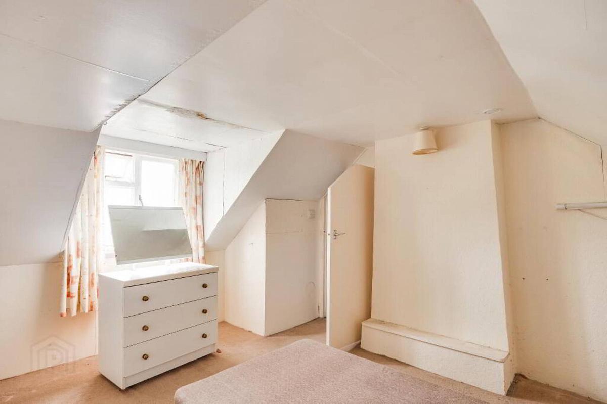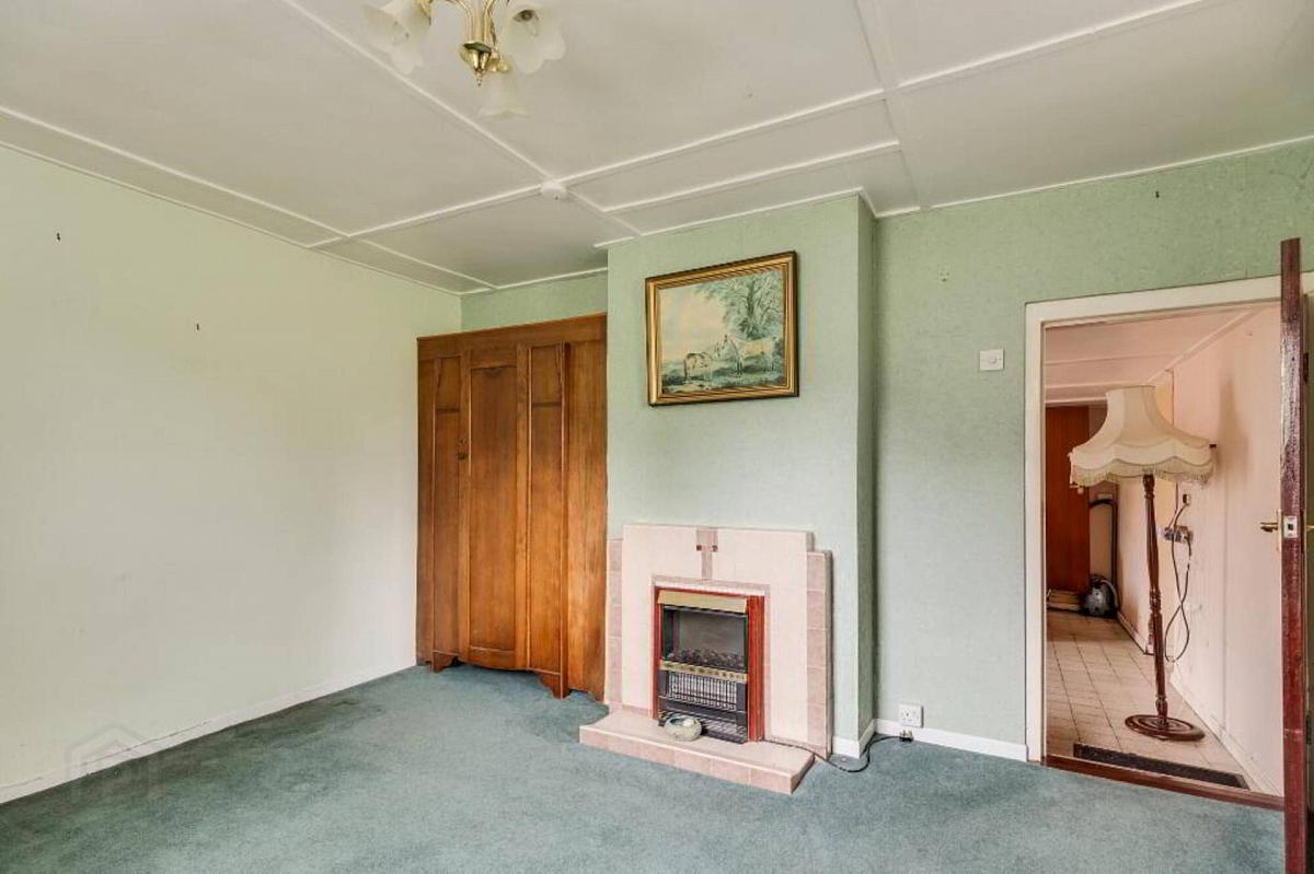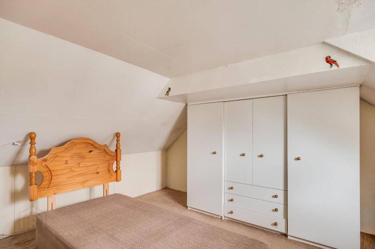 Tiled fireplace surround, panelled ceiling, fitted wardrobe.