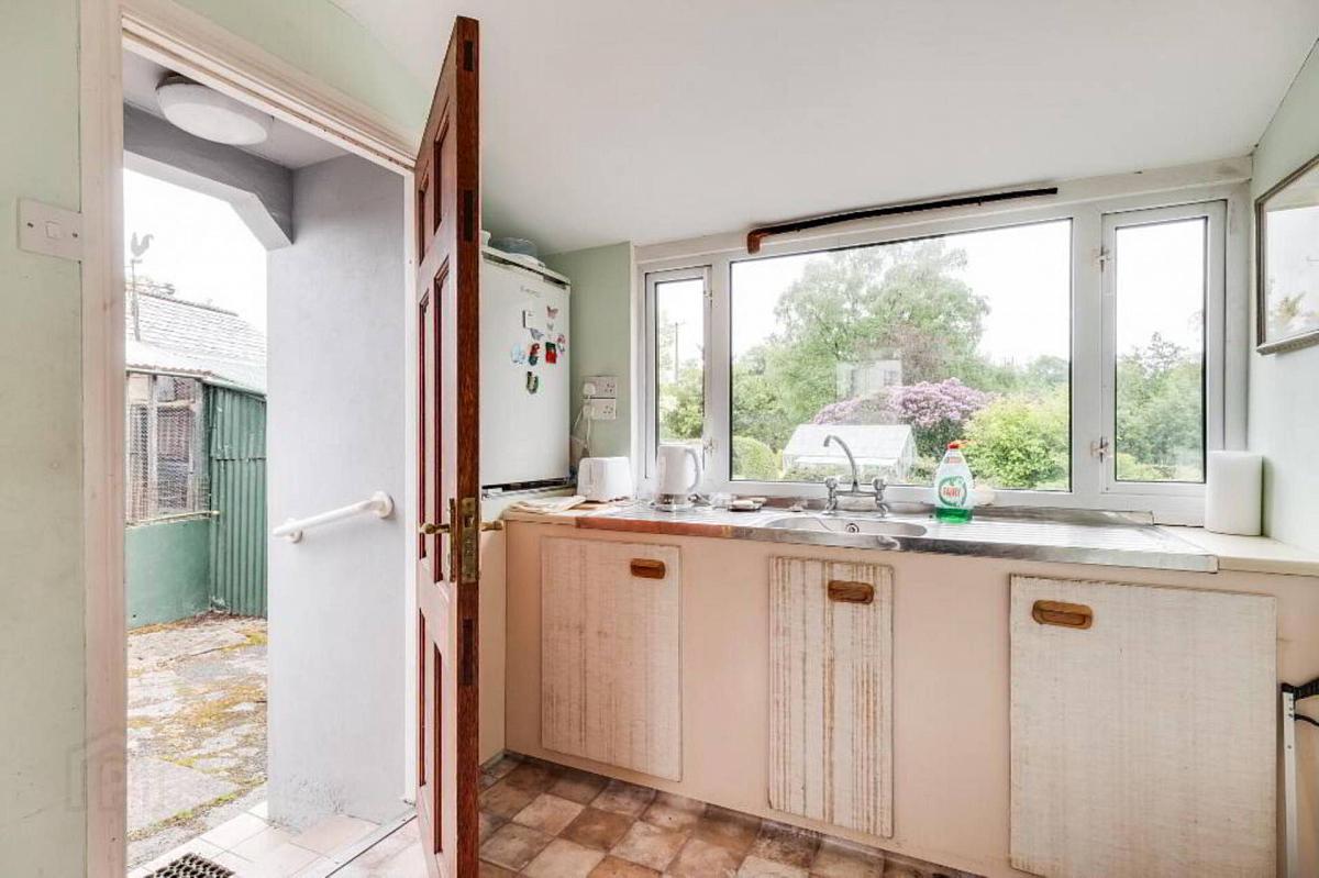 Fitted kitchen units & stainless steel sink unit, panelled exterior door.