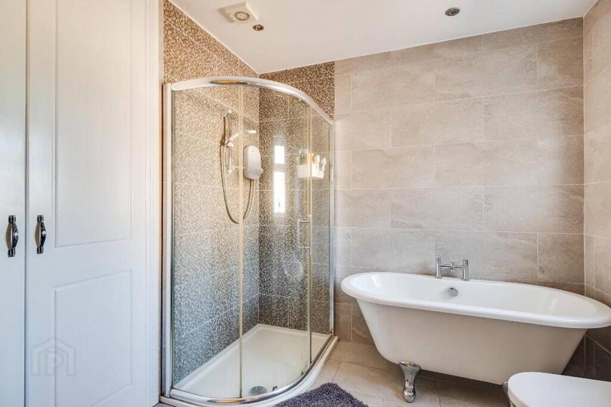 Modern suite with feature bath, step in shower cubicle with electric shower, vanity sink, fully tiled, heated towel rail, hot press, recessed lighting