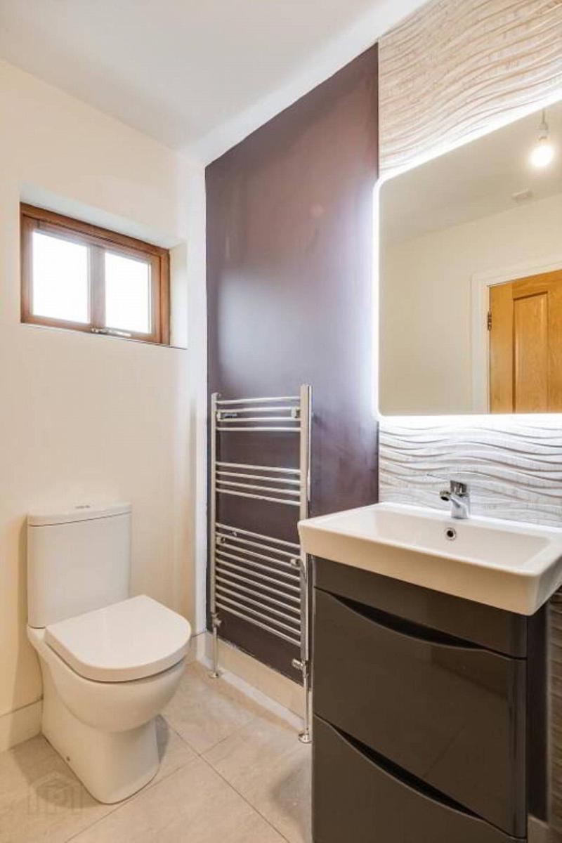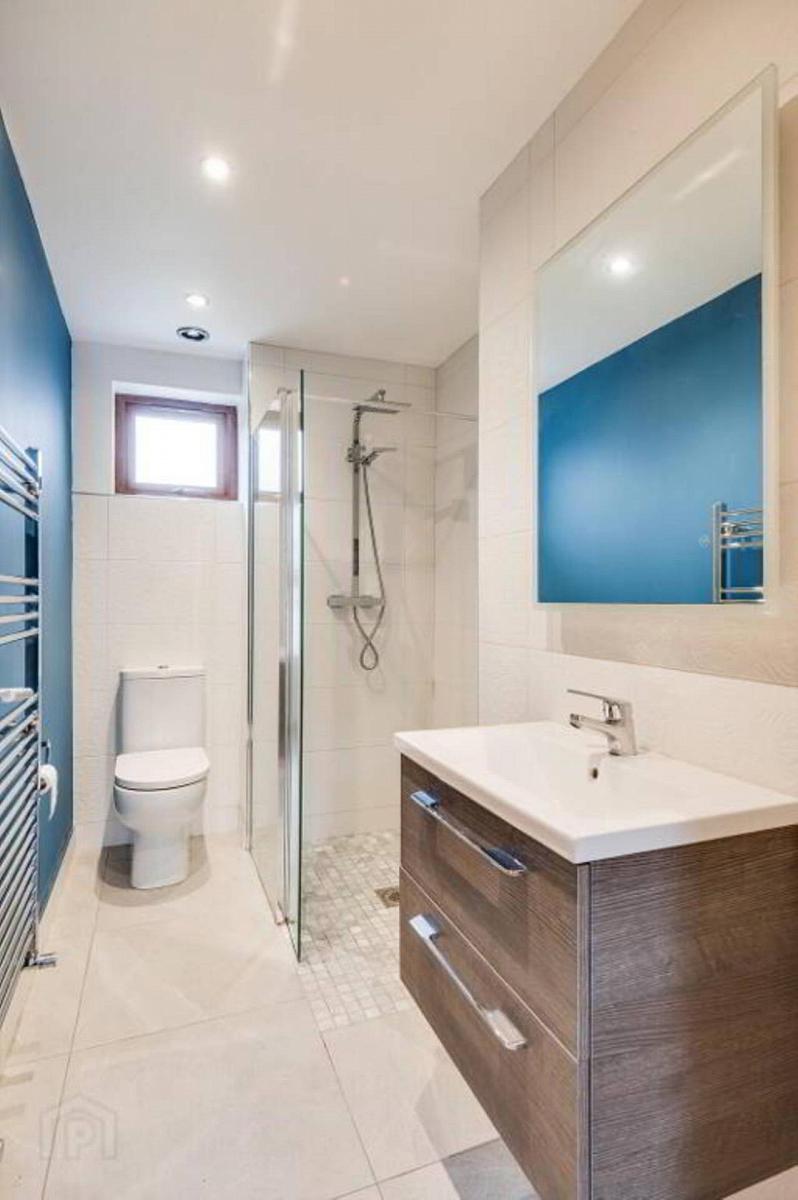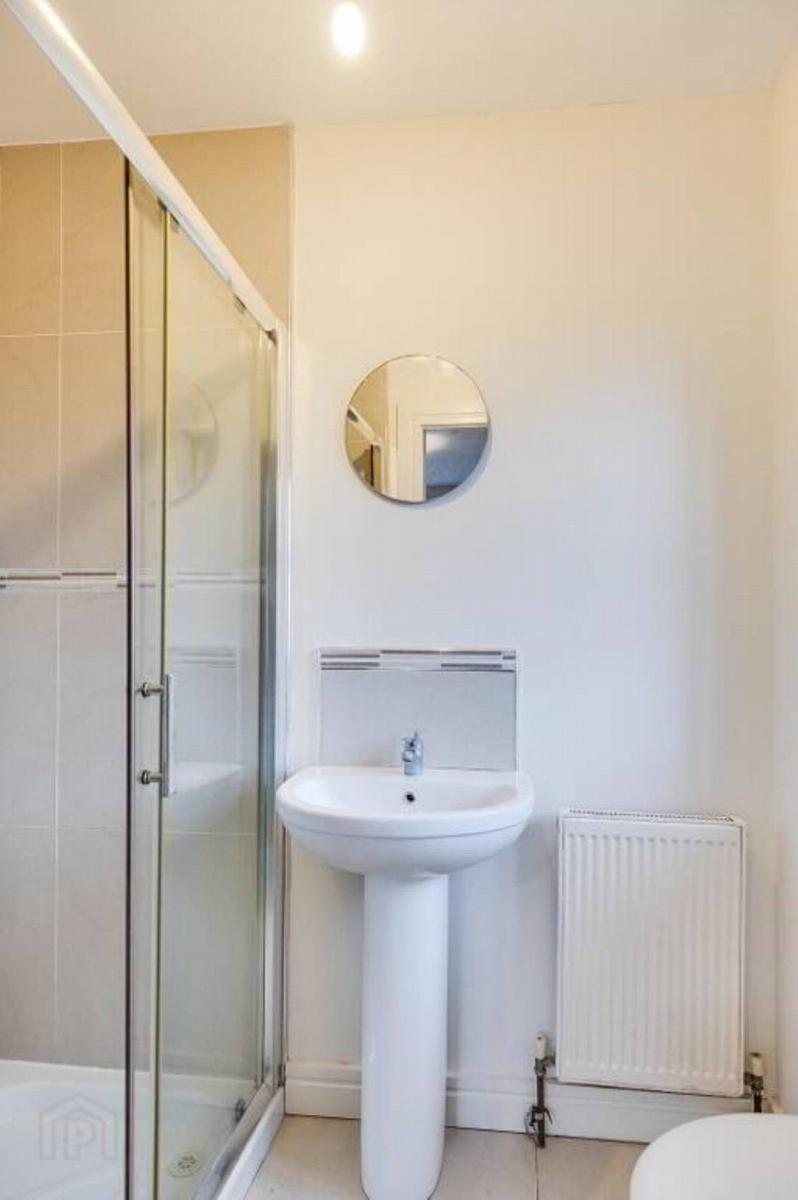 controlled shower, glazed shower screen, vanity unit, heated towel rail, tiled floor & splash back.